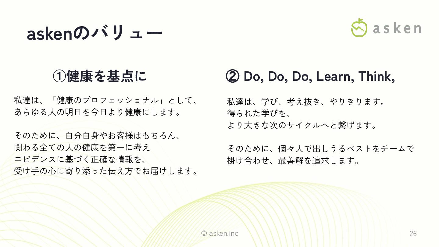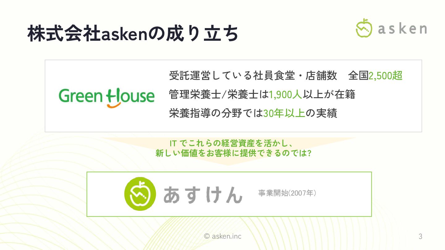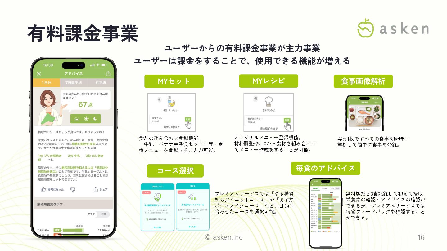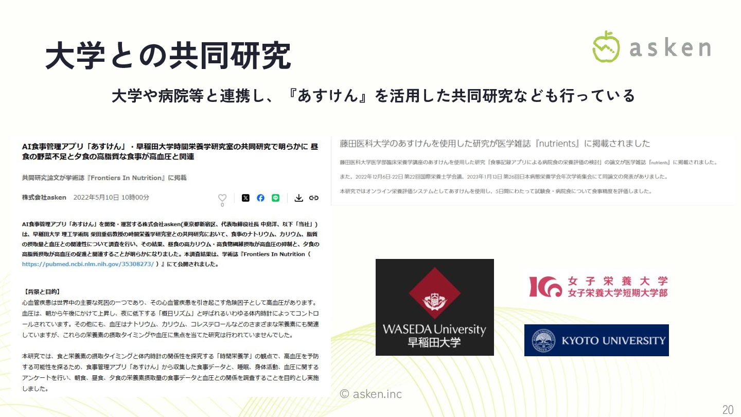 ITベンチャー・外資メーカー・ コンサルティング会社での経 験を経て、2007年に株式会 社askenを設立。企画・要件 定義・マーケティング・事業計 画策定などを幅広く担当し た。 現在は主に経営戦略立案・ア ライアンス・海外展開・データ サイエンスなどの分野を担 当。 ヘルスケアIT関連のセミナー ・カンファレンス等での講演多 数。 女子栄養大学栄養学部卒業 後、大手フードサービス企業 に入社。100社以上の企業で 健康アドバイザーを務めた 後、2007年、新規事業の立ち 上げメンバーとして株式会社 askenに参画し、以後『あすけ ん』の企画・コンテンツ制作・ 開発に携わる。現在、株式会 社asken取締役としてあすけ ん事業統括責任者を務める。