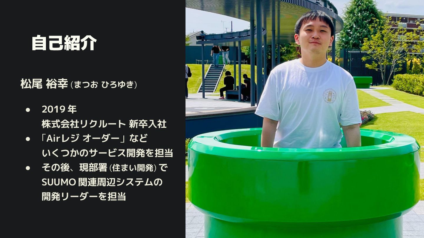 新卒入社 • 「Airレジ オーダー」など い つ のサービス開発を担当 • その後、現部署 (住まい開発) で SUUMO 関連周辺システムの 開発リーダーを担当