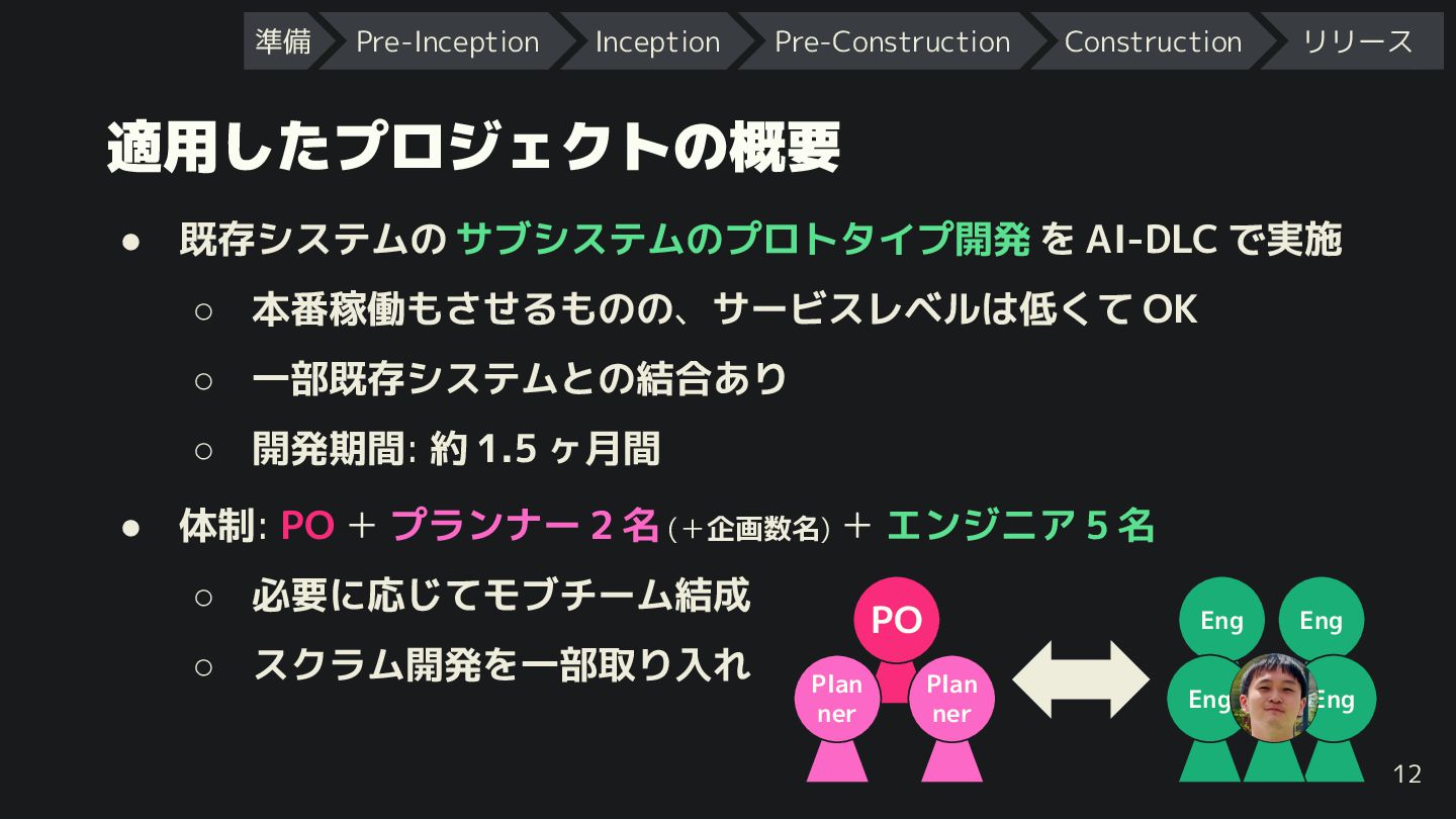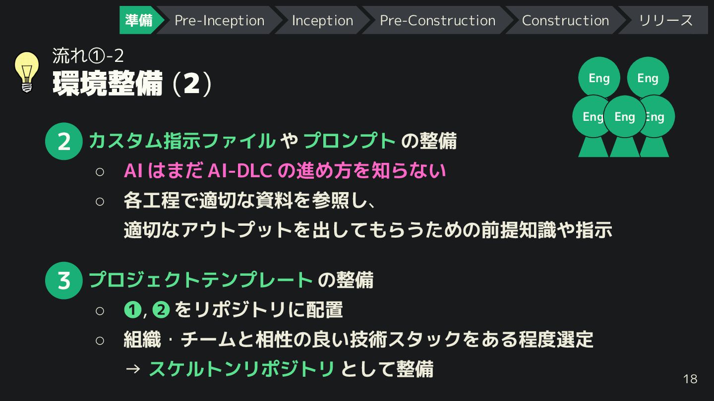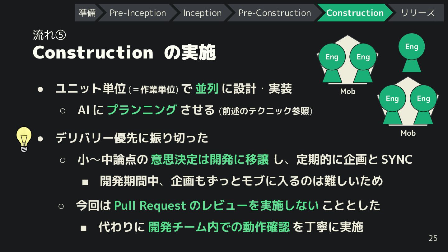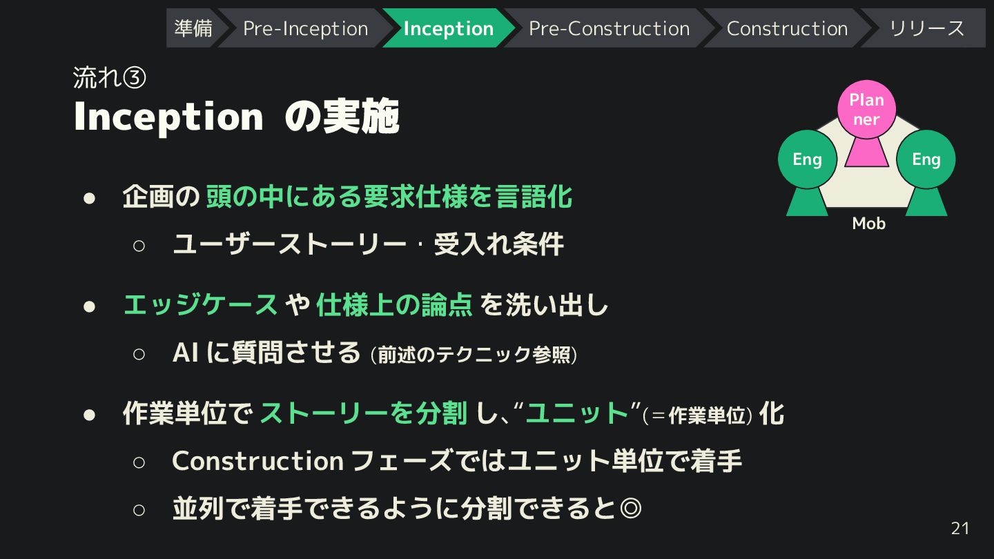 ner Eng Eng Mob • エッジケース や 仕様上の論点 を洗い出し ◦ AI に質問させる (前述のテクニック参照) • 作業単位で ストーリーを分割 し、“ユニット”(=作業単位) 化 ◦ Construction フェーズではユニット単位で着手 ◦ 並列で着手で るように分割で ると◎ 準備 Pre-Inception Inception Pre-Construction Construction リリース