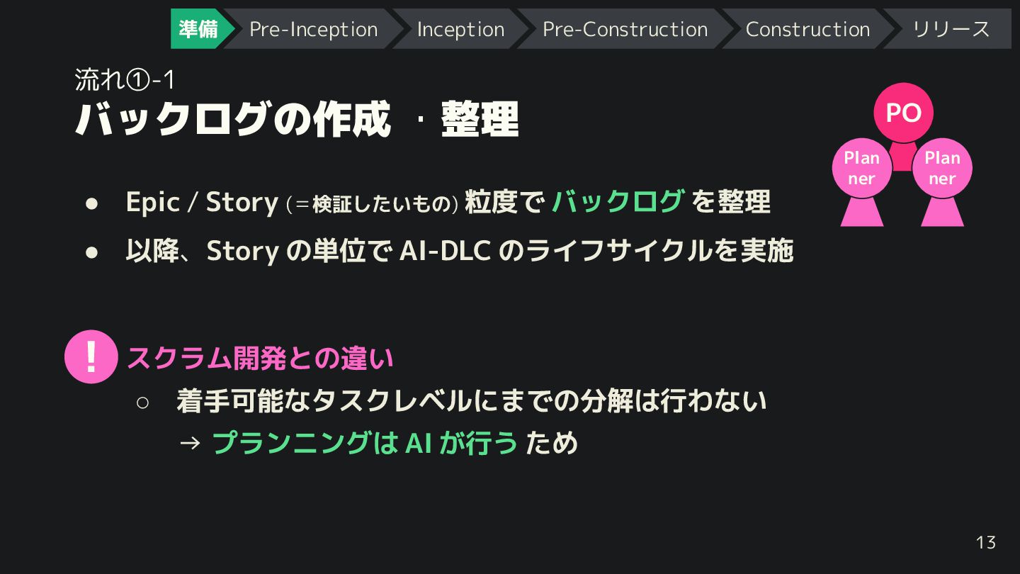 を整理 • 以降、Story の単位で AI-DLC のライフサイクルを実施 13 • スクラム開発との違い ◦ 着手可能なタスクレベルにまでの分解は行わない → プランニングは AI 行う ため PO Plan ner Plan ner ! 準備 Pre-Inception Inception Pre-Construction Construction リリース