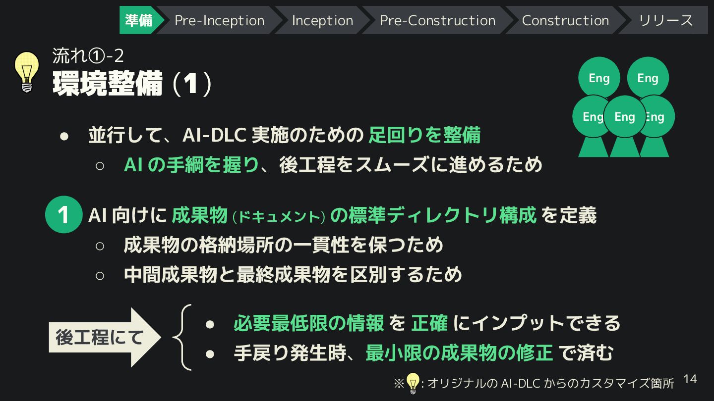 14 Eng Eng Eng Eng Eng • AI 向 に 成果物 (ドキュメント) の標準ディレクトリ構成 を定義 ◦ 成果物の格納場所の一貫性を保つため ◦ 中間成果物と最終成果物を区別するため 1 • 必要最低限の情報 を 正確 にインプットで る • 手戻り発生時、最小限の成果物の修正 で済む 後工程にて 準備 Pre-Inception Inception Pre-Construction Construction リリース ※  : オリジナルの AI-DLC からのカスタマイズ箇所