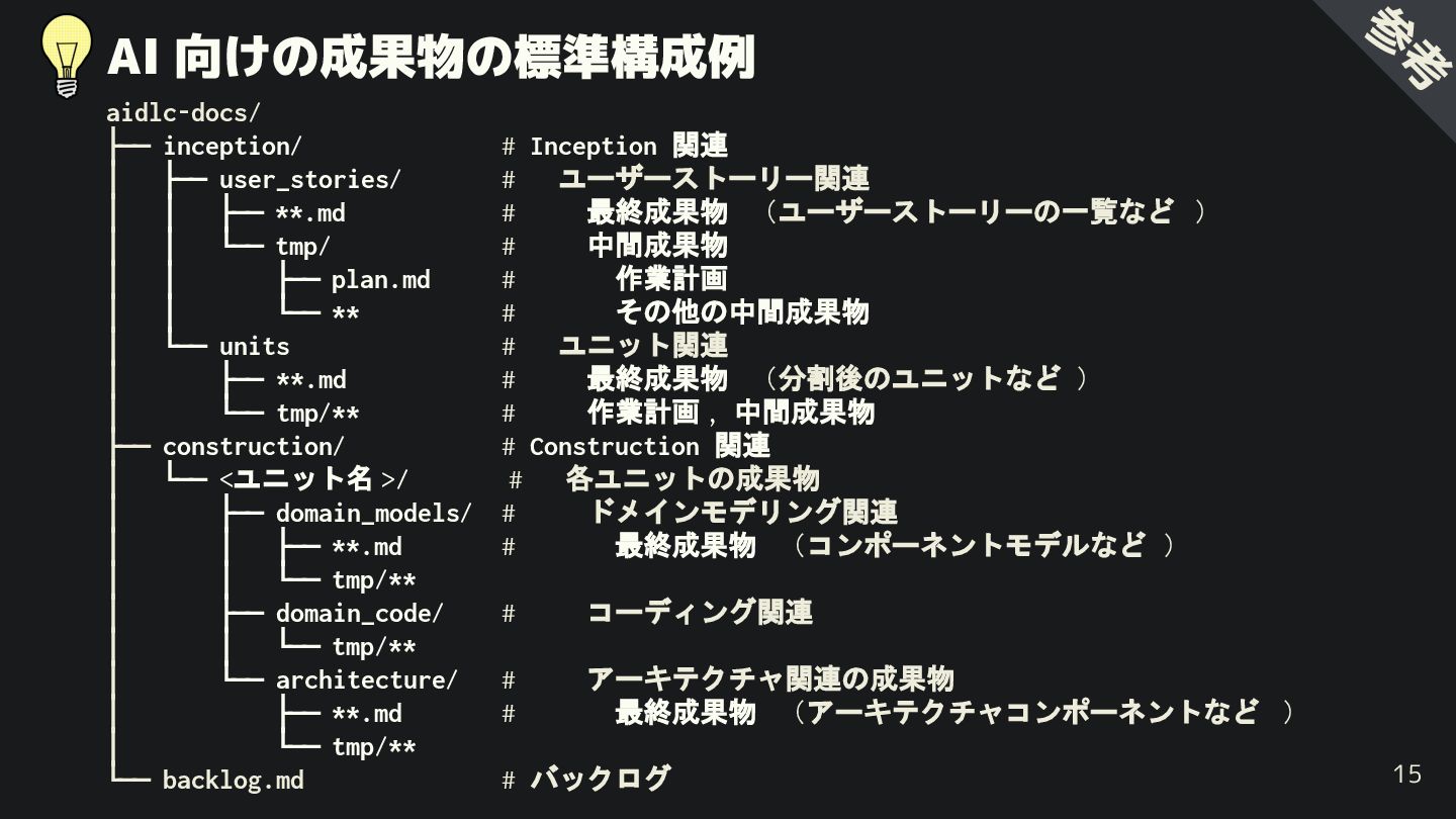user_stories/ # ユーザーストーリー関連 │ │ ├── **.md # 最終成果物 (ユーザーストーリーの一覧など ) │ │ └── tmp/ # 中間成果物 . │ │ ├── plan.md # 作業計画 . │ │ └── ** # その他の中間成果物 . │ └── units # ユニット関連 │ ├── **.md # 最終成果物 (分割後のユニットなど ) │ └── tmp/** # 作業計画 , 中間成果物 . ├── construction/ # Construction 関連 │ └── <ユニット名 >/ # 各ユニットの成果物 │ ├── domain_models/ # ドメインモデリング関連 │ │ ├── **.md # 最終成果物 (コンポーネントモデルなど ) │ │ └── tmp/** . │ ├── domain_code/ # コーディング関連 │ │ └── tmp/** . │ └── architecture/ # アーキテクチャ関連の成果物 │ ├── **.md # 最終成果物 (アーキテクチャコンポーネントなど ) │ └── tmp/** . └── backlog.md # バックログ 17 参 考 最終成果物と中間成果物を区別 (後工程では最終成果物のみ参照)