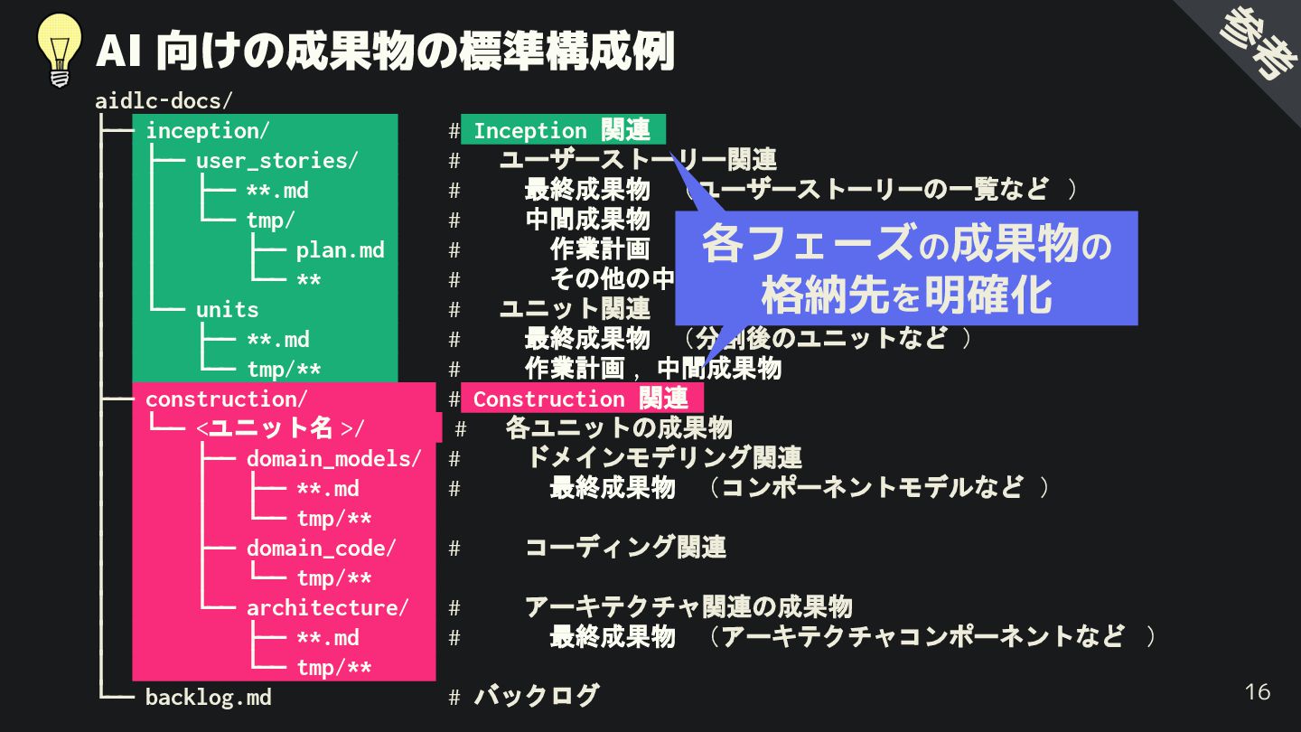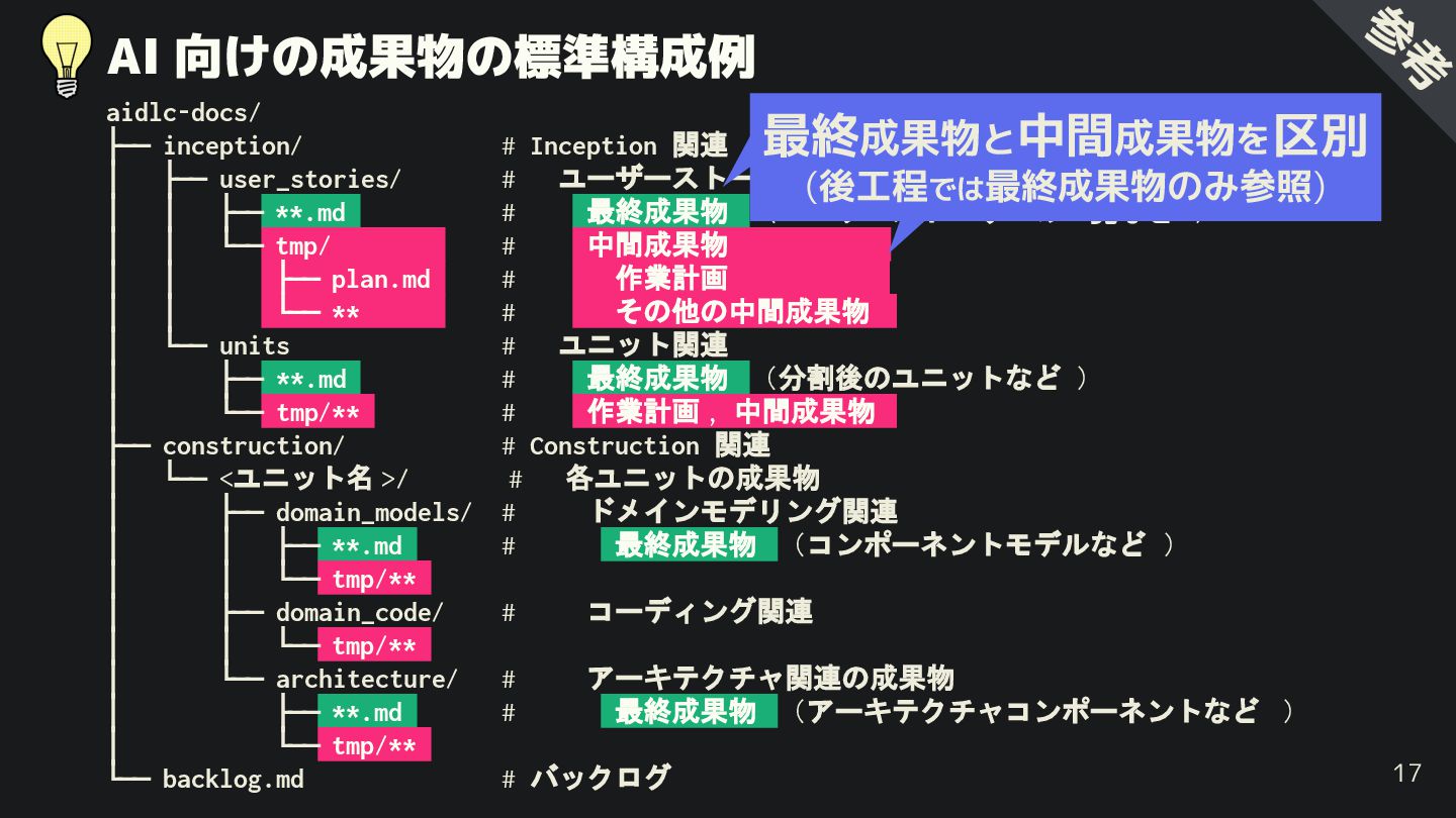 ├── user_stories/ # ユーザーストーリー関連 │ │ ├── **.md # 最終成果物 (ユーザーストーリーの一覧など ) │ │ └── tmp/ # 中間成果物 . │ │ ├── plan.md # 作業計画 . │ │ └── ** # その他の中間成果物 . │ └── units # ユニット関連 │ ├── **.md # 最終成果物 (分割後のユニットなど ) │ └── tmp/** # 作業計画 , 中間成果物 . ├── construction/ # Construction 関連 . │ └── <ユニット名 >/ # 各ユニットの成果物 │ ├── domain_models/ # ドメインモデリング関連 │ │ ├── **.md # 最終成果物 (コンポーネントモデルなど ) │ │ └── tmp/** . │ ├── domain_code/ # コーディング関連 │ │ └── tmp/** . │ └── architecture/ # アーキテクチャ関連の成果物 │ ├── **.md # 最終成果物 (アーキテクチャコンポーネントなど ) │ └── tmp/** . └── backlog.md # バックログ 16 参 考 各フェーズの成果物の 格納先を明確化