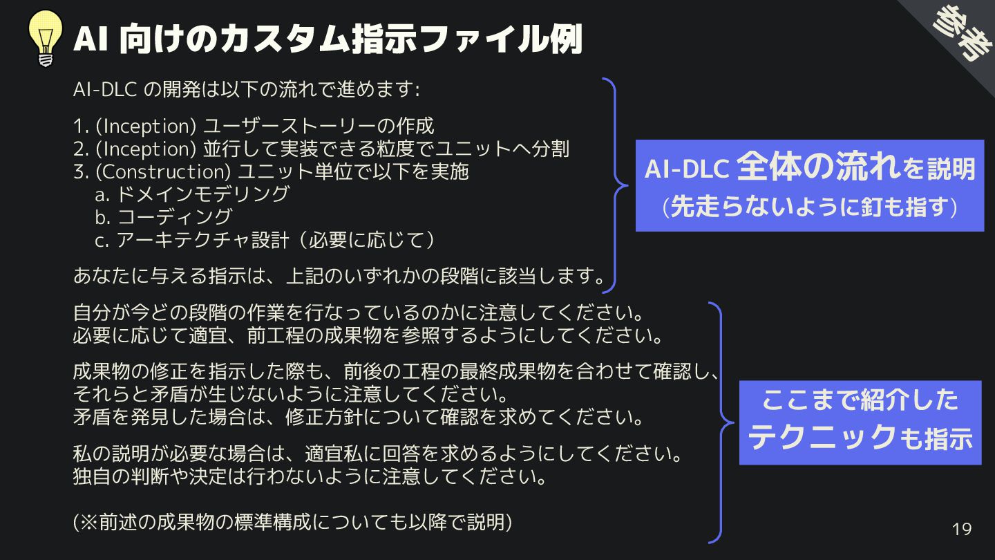 3. (Construction) ユニット単位で以下を実施 a. ドメインモデリング b. コーディング c. アーキテクチャ設計(必要に応じて) あなたに与える指示は、上記のいずれかの段階に該当します。 自分が今どの段階の作業を行なっているのかに注意してください。 必要に応じて適宜、前工程の成果物を参照するようにしてください。 成果物の修正を指示した際も、前後の工程の最終成果物を合わせて確認し、 それらと矛盾が生じないように注意してください。 矛盾を発見した場合は、修正方針について確認を求めてください。 私の説明が必要な場合は、適宜私に回答を求めるようにしてください。 独自の判断や決定は行わないように注意してください。 (※前述の成果物の標準構成についても以降で説明) 19 参 考 AI-DLC 全体の流れを説明 (先走らないように釘も指す) まで紹介した テクニックも指示