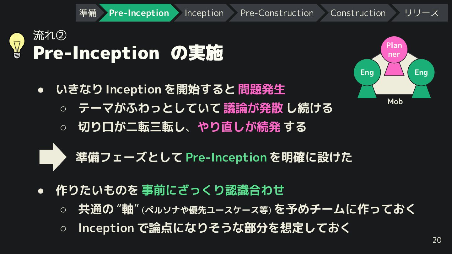 テーマ ふわっとしていて 議論 発散 し続 る ◦ 切り口 二転三転し、やり直し 続発 する 20 準備フェーズとして Pre-Inception を明確に設 た • 作りたいものを 事前にざっ り認識合わせ ◦ 共通の “軸” (ペルソナや優先ユースケース等) を予めチームに作って ◦ Inception で論点になりそうな部分を想定して Plan ner Eng Eng Mob 準備 Pre-Inception Inception Pre-Construction Construction リリース
