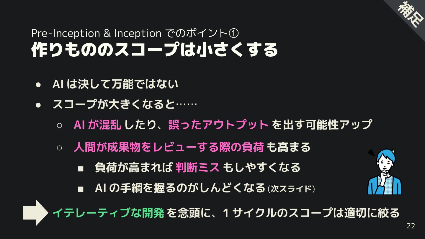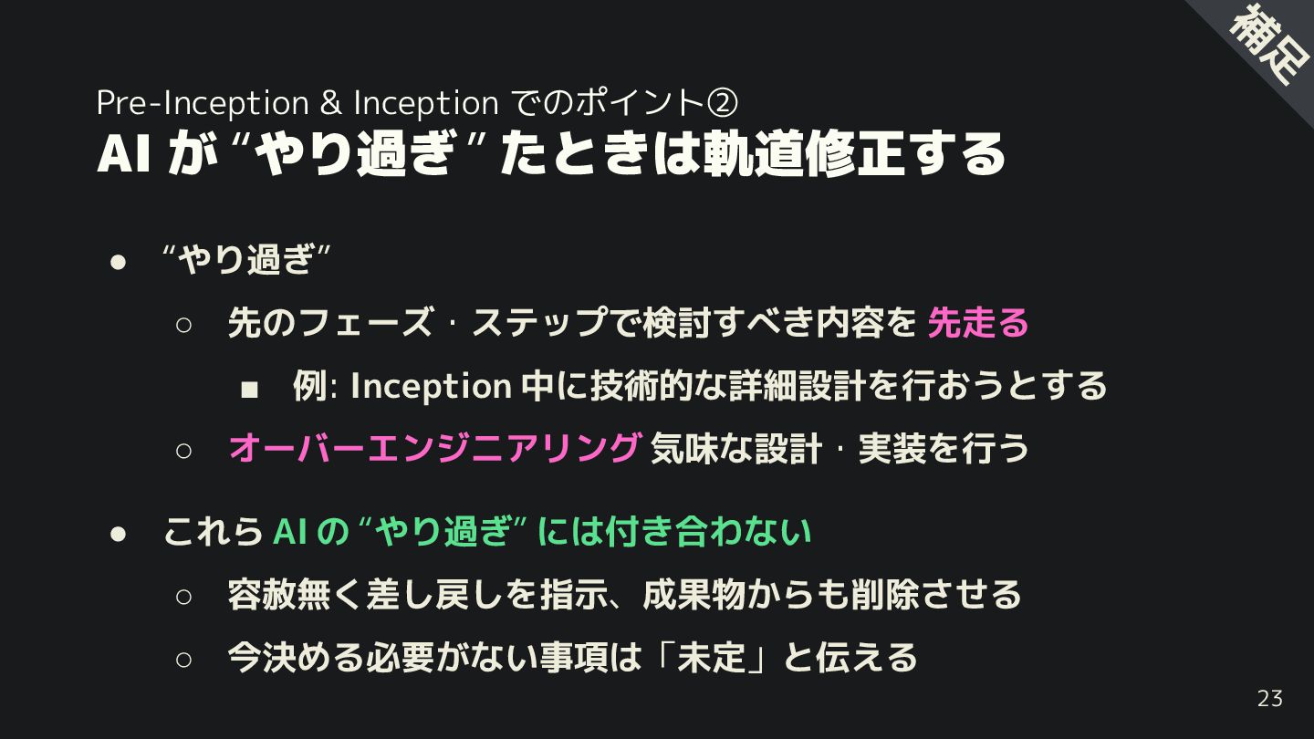 “やり過 ” ◦ 先のフェーズ・ステップで検討すべ 内容を 先走る ▪ 例: Inception 中に技術的な詳細設計を行 うとする ◦ オーバーエンジニアリング 気味な設計・実装を行う 23 補 足 • れら AI の “やり過 ” には付 合わない ◦ 容赦無 差し戻しを指示、成果物 らも削除させる ◦ 今決める必要 ない事項は「未定」と伝える