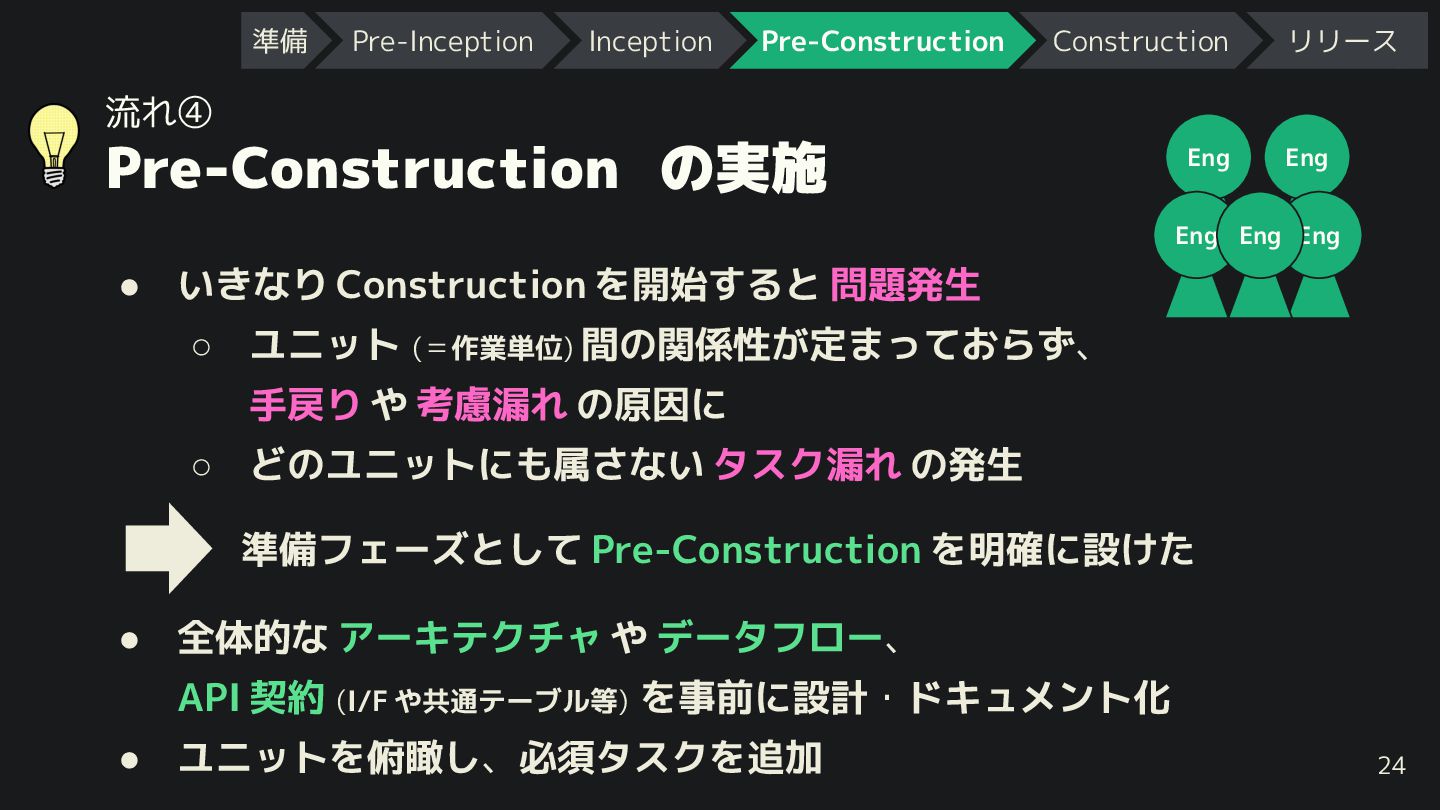 ユニット (=作業単位) 間の関係性 定まって らず、 手戻り や 考慮漏れ の原因に ◦ どのユニットにも属さない タスク漏れ の発生 24 Eng Eng Eng Eng Eng 準備フェーズとして Pre-Construction を明確に設 た • 全体的な アーキテクチャ や データフロー、 API 契約 (I/F や共通テーブル等) を事前に設計・ドキュメント化 • ユニットを俯瞰し、必須タスクを追加 準備 Pre-Inception Inception Pre-Construction Construction リリース