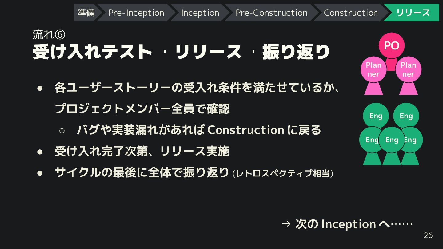 Construction に戻る • 受 入れ完了次第、リリース実施 • サイクルの最後に全体で振り返り (レトロスペクティブ相当) → 次の Inception へ…… 26 PO Plan ner Plan ner Eng Eng Eng Eng Eng 準備 Pre-Inception Inception Pre-Construction Construction リリース