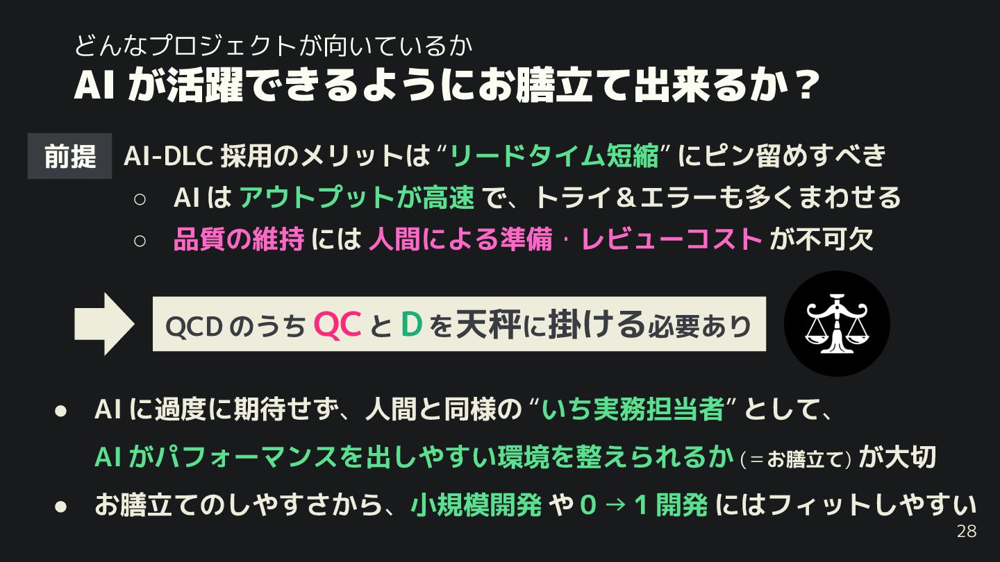 25. どんなプロジェクトが向いているか AI 活躍で るように 膳立て出来る ? • AI-DLC 採用のメリットは “リードタイム短縮”