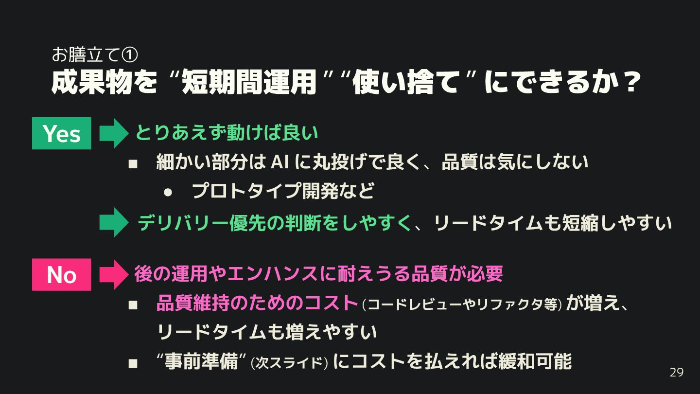 にピン留めすべ ◦ AI は アウトプット 高速 で、トライ&エラーも多 まわせる ◦ 品質の維持 には 人間による準備・レビューコスト 不可欠 28 前提 • AI に過度に期待せず、人間と同様の “いち実務担当者” として、 AI パフォーマンスを出しやすい環境を整えられる (= 膳立て) 大切 • 膳立てのしやすさ ら、小規模開発 や 0 → 1 開発 にはフィットしやすい QCD のうち QC と D を天秤に掛 る必要あり