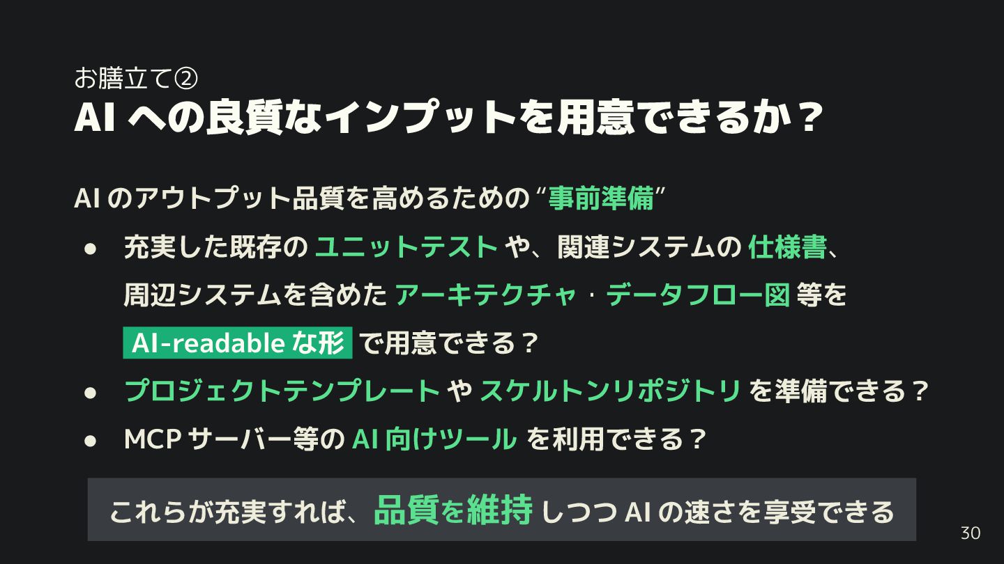 充実すれば、品質を維持 しつつ AI の速さを享受で る • 充実した既存の ユニットテスト や、関連システムの 仕様書、 周辺システムを含めた アーキテクチャ・データフロー図 等を AI-readable な形 で用意で る? • プロジェクトテンプレート や スケルトンリポジトリ を準備で る? • MCP サーバー等の AI 向 ツール を利用で る?