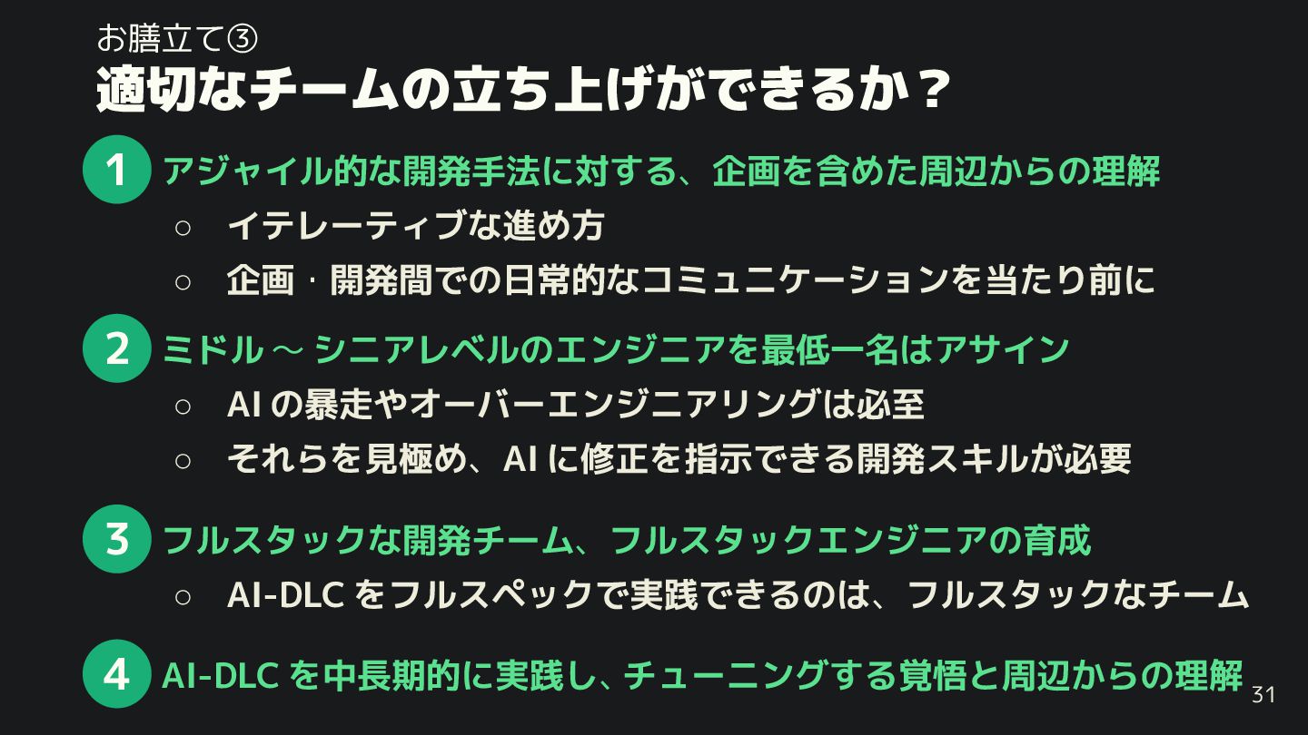 ◦ 企画・開発間での日常的なコミュニケーションを当たり前に 31 1 • ミドル 〜 シニアレベルのエンジニアを最低一名はアサイン ◦ AI の暴走やオーバーエンジニアリングは必至 ◦ それらを見極め、AI に修正を指示で る開発スキル 必要 2 • フルスタックな開発チーム、フルスタックエンジニアの育成 ◦ AI-DLC をフルスペックで実践で るのは、フルスタックなチーム 3 • AI-DLC を中長期的に実践し、 チューニングする覚悟と周辺 らの理解 4