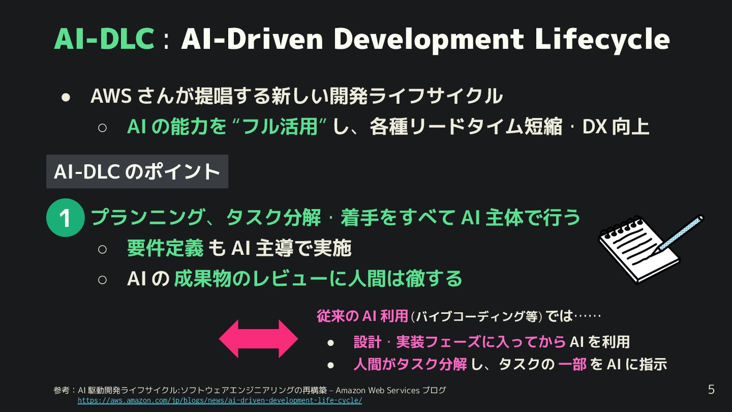 5. AI-DLC : AI-Driven Development Lifecycle • AWS さん 提唱する新しい開発ライフサイクル ◦