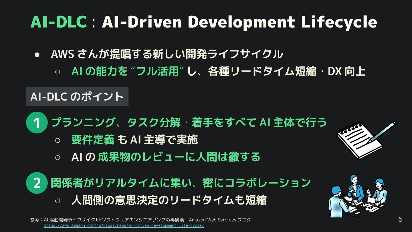 AI の能力を “フル活用” し、各種リードタイム短縮・DX 向上 5 AI-DLC のポイント 従来の AI 利用 (バイブコーディング等) では…… • 設計・実装フェーズに入って ら AI を利用 • 人間 タスク分解 し、タスクの 一部 を AI に指示 • プランニング、タスク分解・着手をすべて AI 主体で行う ◦ 要件定義 も AI 主導で実施 ◦ AI の 成果物のレビューに人間は徹する 1 参考:AI 駆動開発ライフサイクル:ソフトウェアエンジニアリングの再構築 – Amazon Web Services ブログ    https://aws.amazon.com/jp/blogs/news/ai-driven-development-life-cycle/