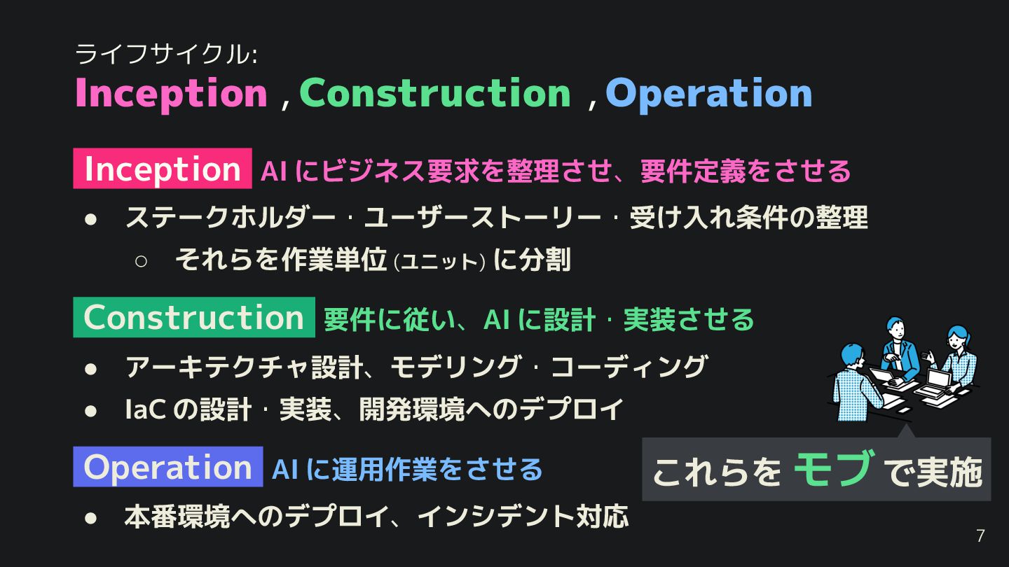 に分割 • アーキテクチャ設計、モデリング・コーディング • IaC の設計・実装、開発環境へのデプロイ • 本番環境へのデプロイ、インシデント対応 ライフサイクル: Inception , Construction , Operation れらを モブ で実施 Construction 要件に従い、AI に設計・実装させる Operation AI に運用作業をさせる