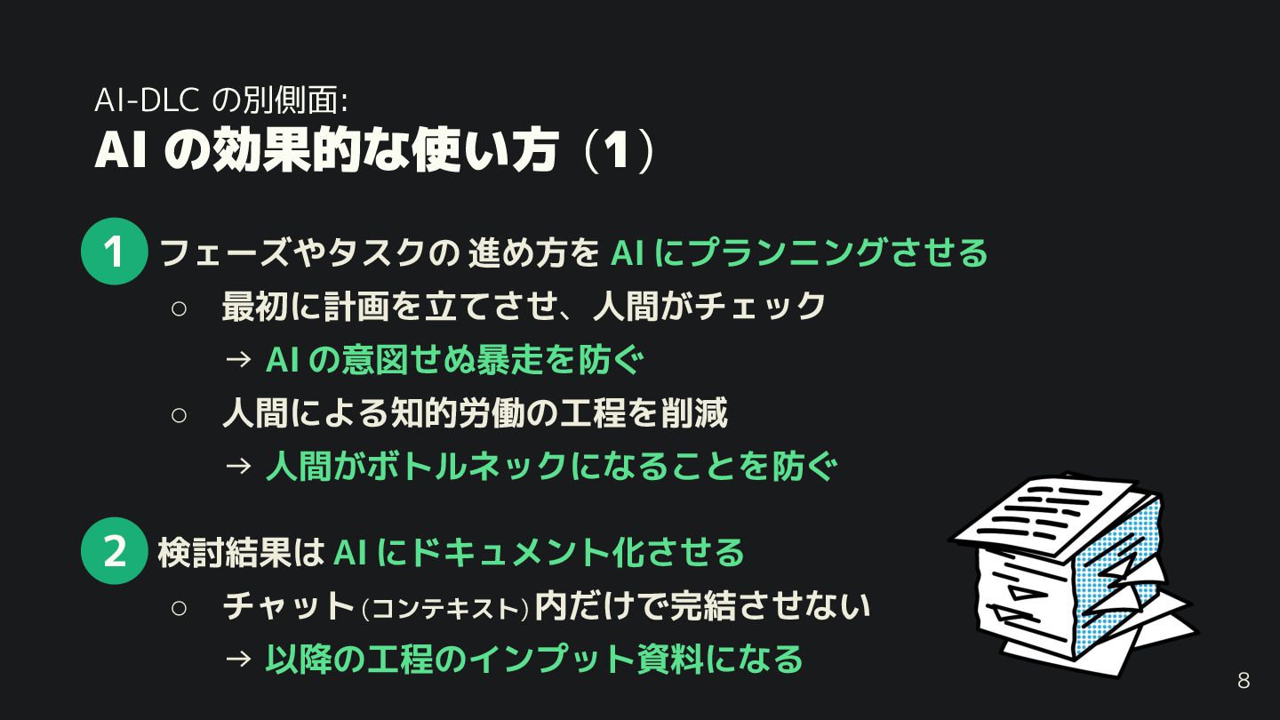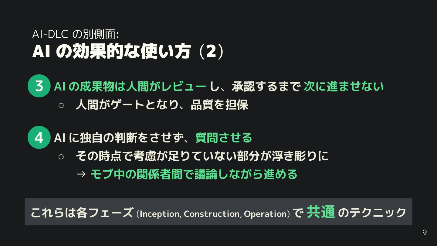 8. AI-DLC の別側面: AI の効果的な使い方 (2) • AI の成果物は人間 レビュー し、承認するまで