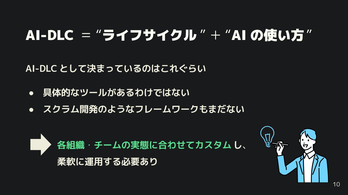 9. AI-DLC = “ライフサイクル ” + “AI の使い方” AI-DLC として決まっているのは れ