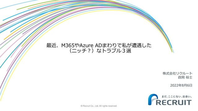 レベル • 第 4 レベル • 第 5 レベル マスタ タイトルの書式設定 1 最近、M365やAzure ADまわりで私が遭遇した (ニッチ?)なトラブル3選 株式会社リクルート 政岡 裕士 2022年8月6日 © Recruit Co., Ltd. All rights reserved.