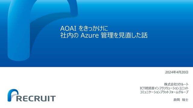 マスタ タイトルの書式設定 AOAI をきっかけに 社内の Azure 管理を見直した話 株式会社リクルート ICT統括室インフラソリューションユニット コミュニケーションプラットフォームグループ