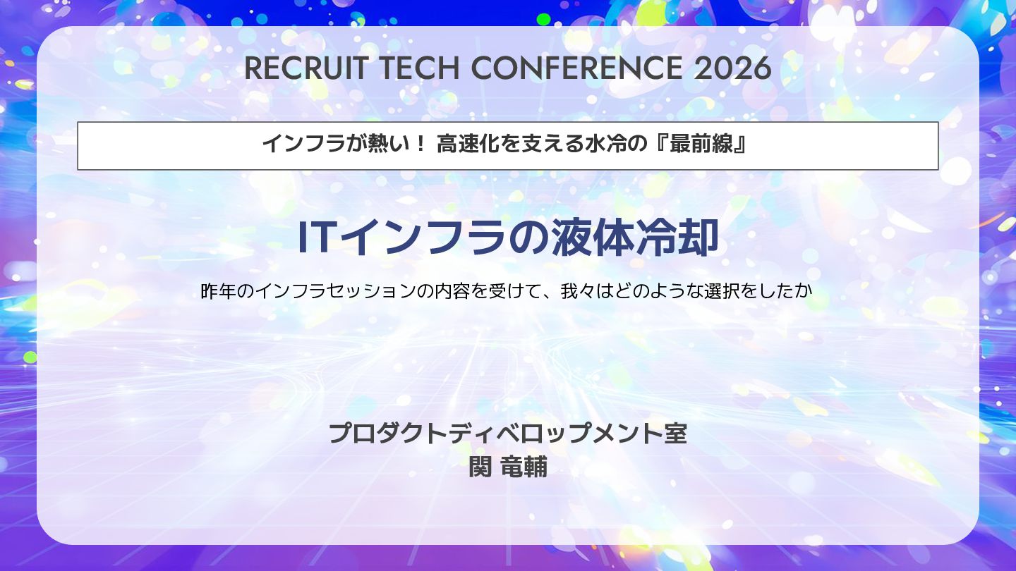 RECRUIT TECH CONFERENCE 2026 ITインフラの液体冷却 インフラが熱い! 高速化を支える水冷の『最前線』 昨年のインフラセッションの内容を受けて、我々はどのような選択をしたか プロダクトディベロップメント室 関