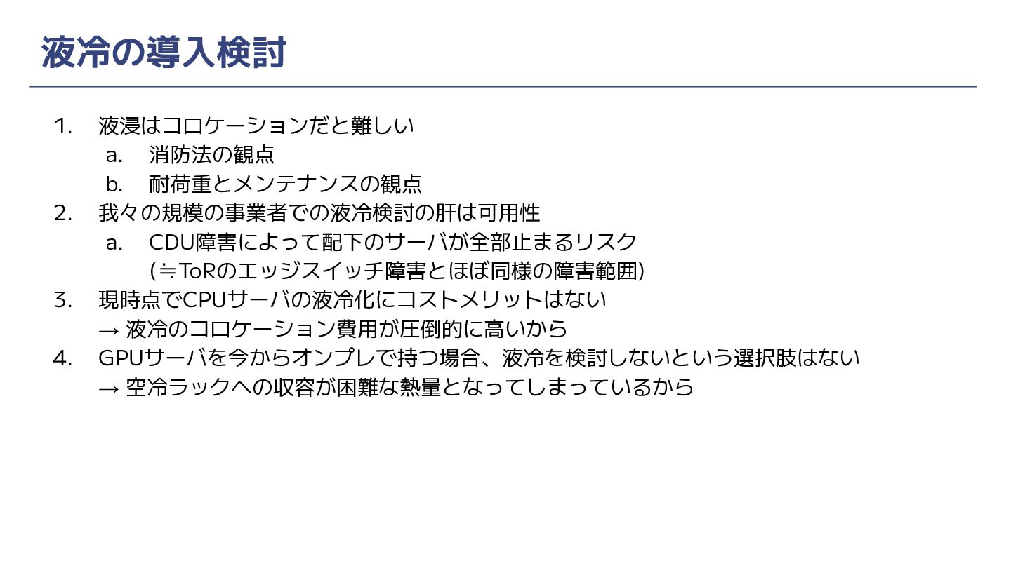 液冷の導入検討 1. 液浸はコロケーションだと難しい a. 消防法の観点 b. 耐荷重とメンテナンスの観点 2. 我々の規模の事業者での液冷検討の肝は可用性 a.