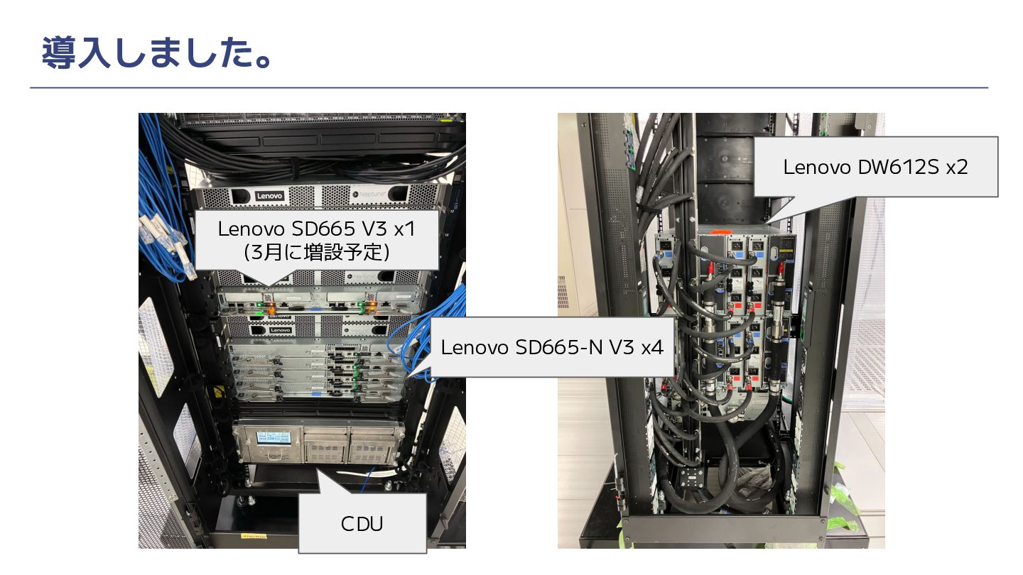 導入しました。 Lenovo SD665 V3 x1 (3月に増設予定) Lenovo SD665-N V3 x4