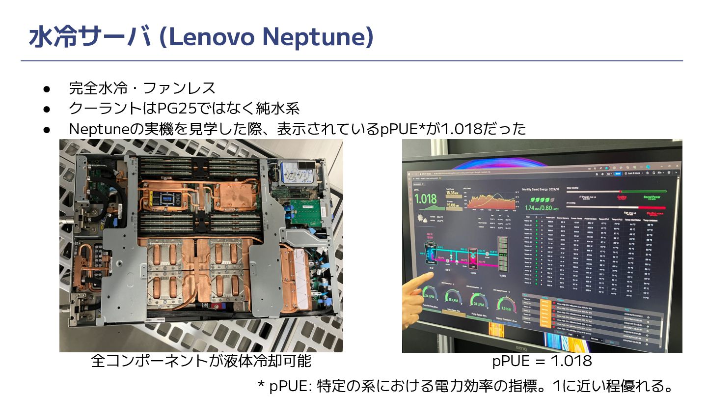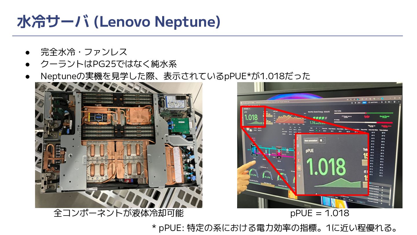 • 完全水冷・ファンレス • クーラントはPG25ではなく純水系 • Neptuneの実機を見学した際、表示されているpPUE*が1.018だった 水冷サーバ (Lenovo Neptune) pPUE