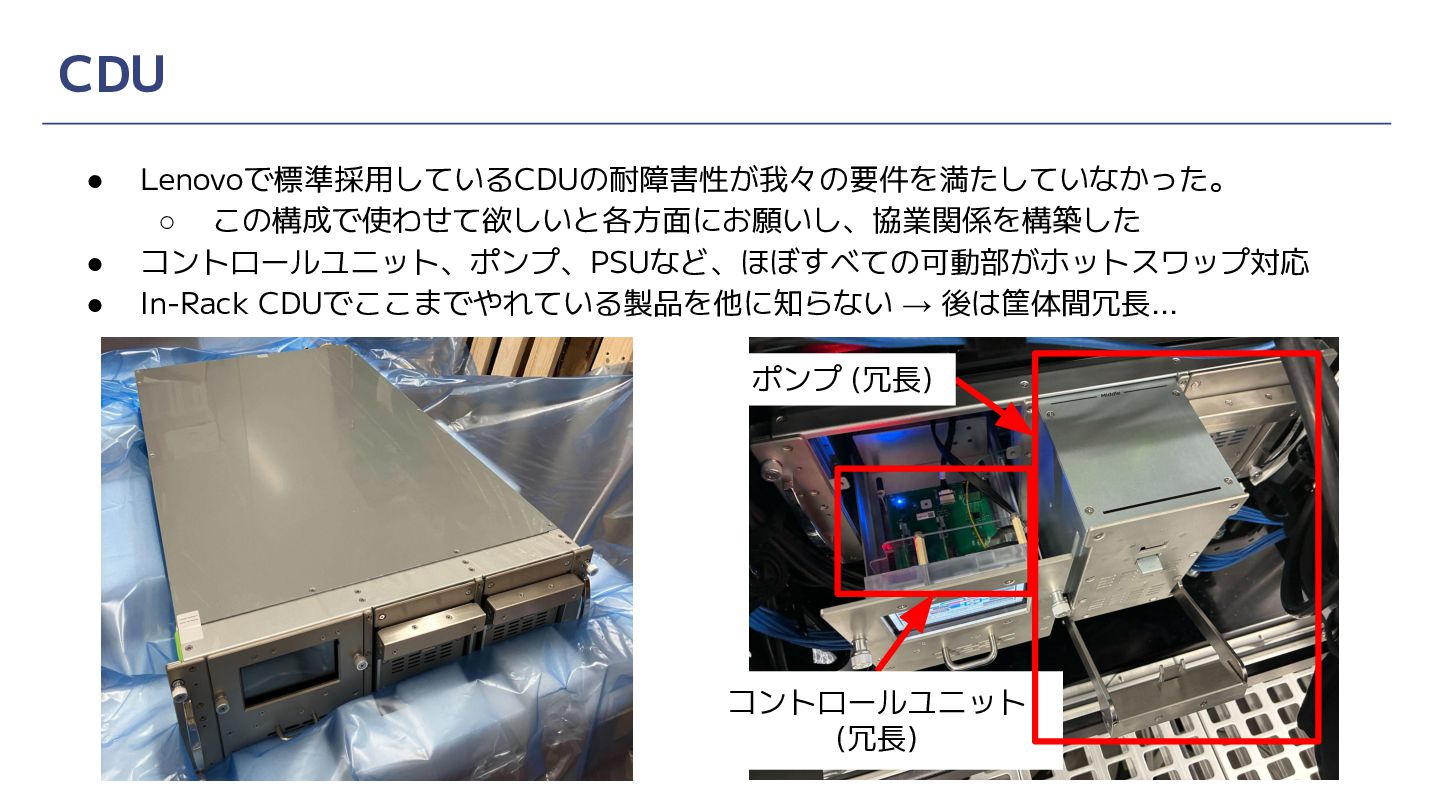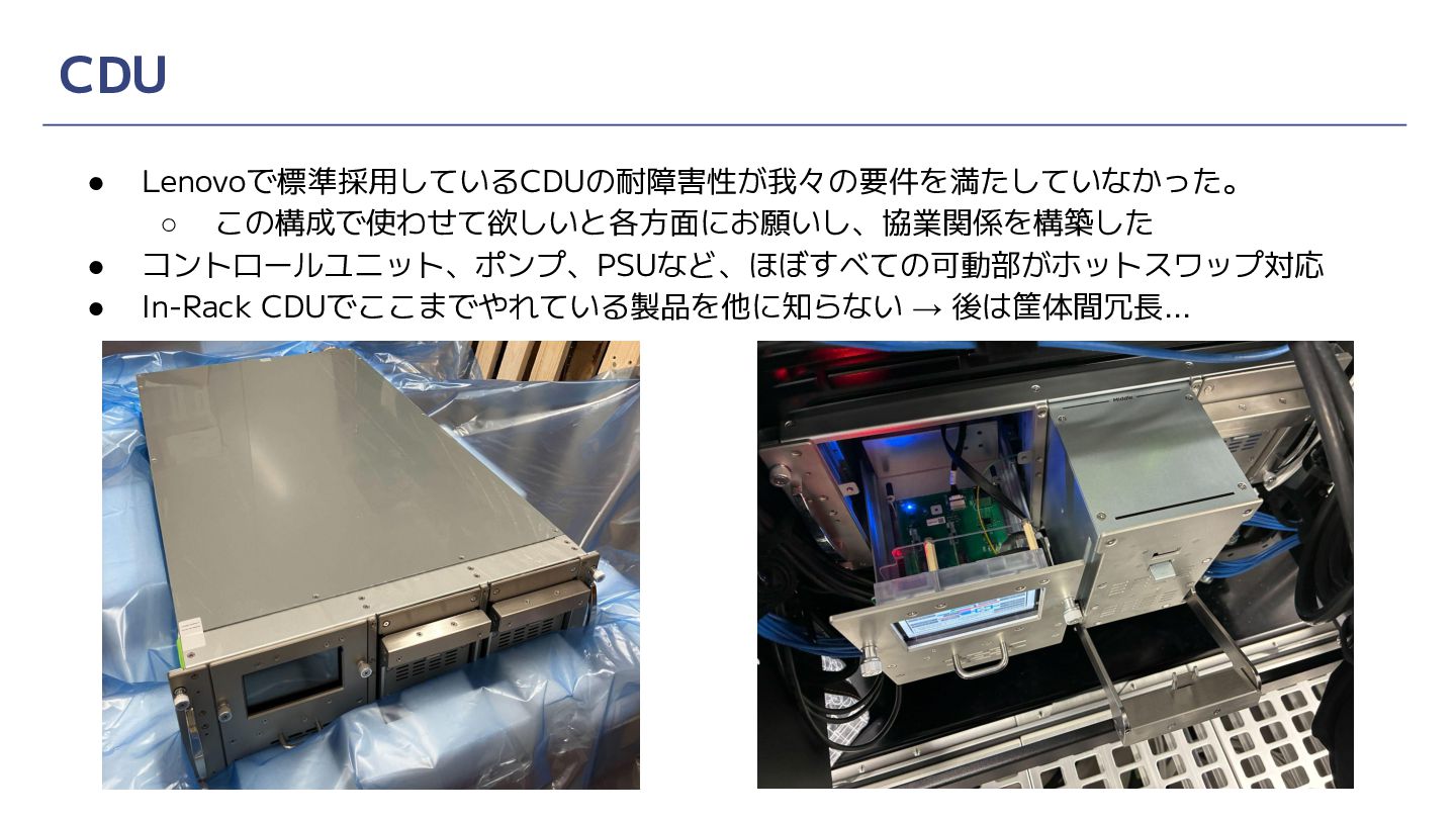 CDU • Lenovoで標準採用しているCDUの耐障害性が我々の要件を満たしていなかった。 ◦ この構成で使わせて欲しいと各方面にお願いし、協業関係を構築した • コントロールユニット、ポンプ、PSUなど、ほぼすべての可動部がホットスワップ対応 • In-Rack CDUでここまでやれている製品を他に知らない