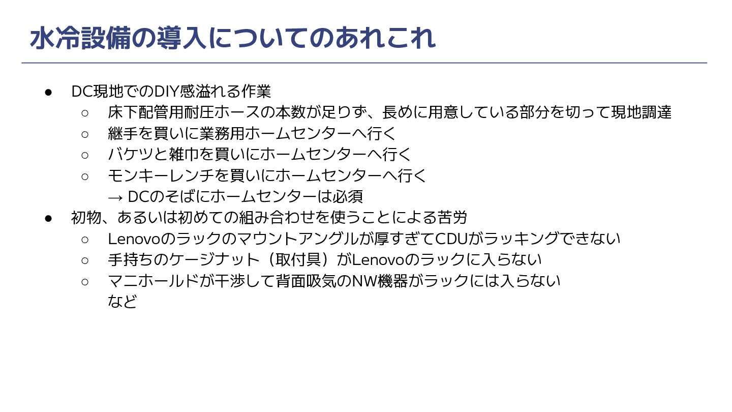 モンキーレンチを買いにホームセンターへ行く → DCのそばにホームセンターは必須 • 初物、あるいは初めての組み合わせを使うことによる苦労 ◦ Lenovoのラックのマウントアングルが厚すぎてCDUがラッキングできない ◦ 手持ちのケージナット(取付具)がLenovoのラックに入らない ◦ マニホールドが干渉して背面吸気のNW機器がラックには入らない など