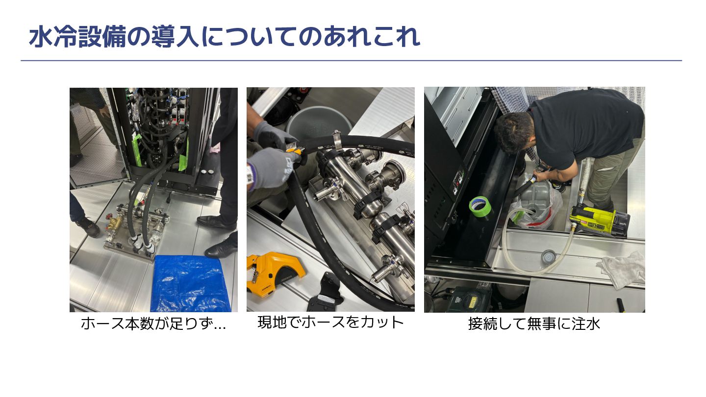水冷設備の導入についてのあれこれ • DC現地でのDIY感溢れる作業 ◦ 床下配管用耐圧ホースの本数が足りず、長めに用意している部分を切って現地調達 ◦ 継手を買いに業務用ホームセンターへ行く ◦ バケツと雑巾を買いにホームセンターへ行く ◦