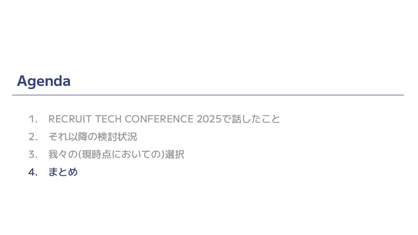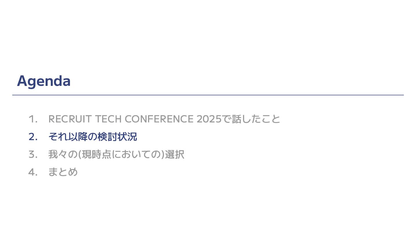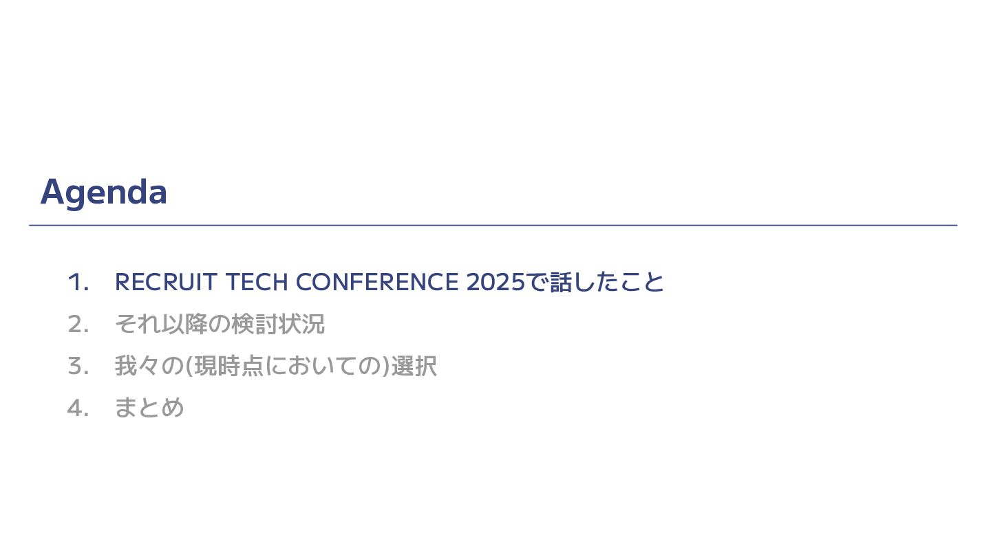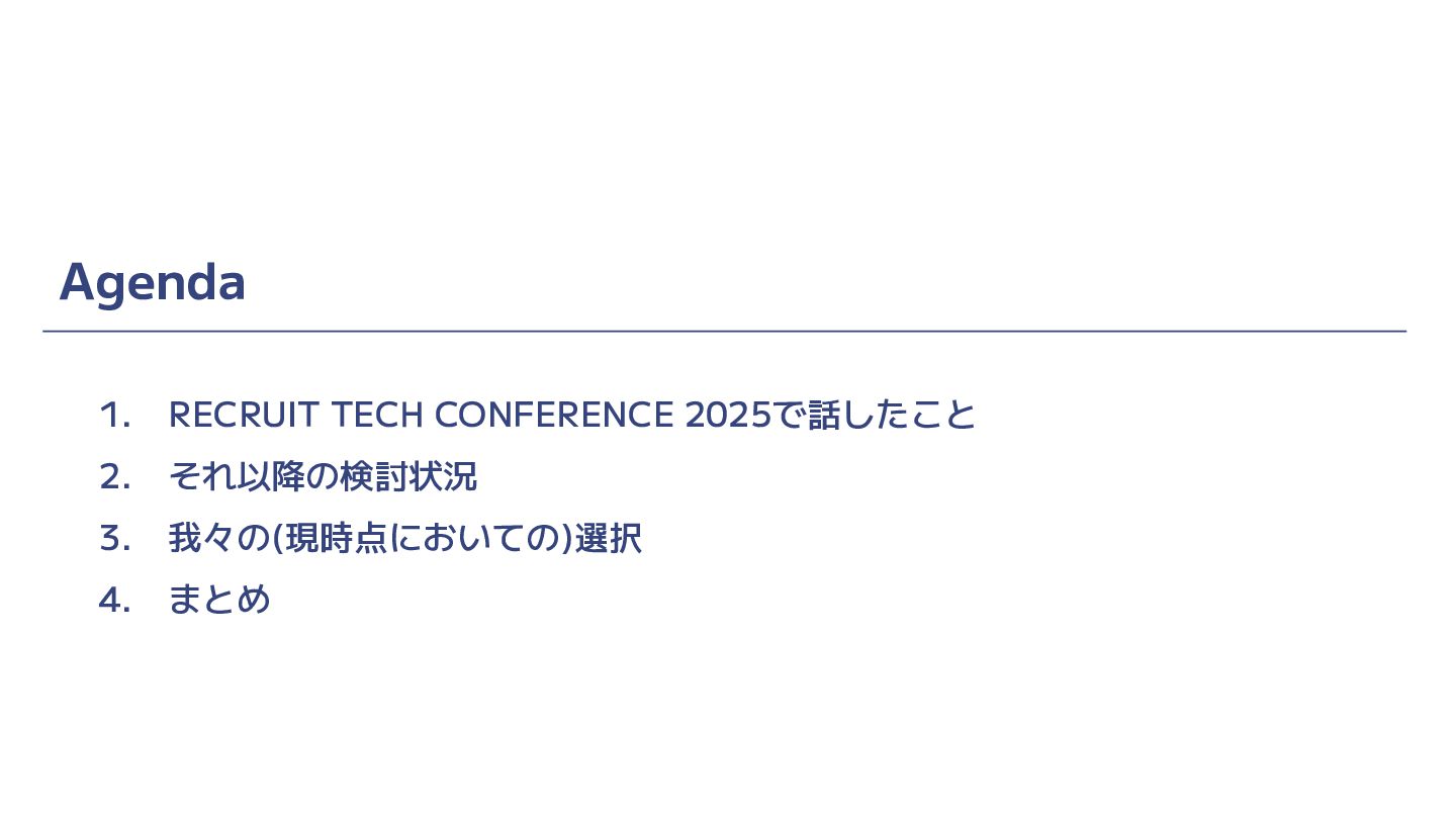 Agenda 1. RECRUIT TECH CONFERENCE 2025で話したこと 2. それ以降の検討状況 3. 我々の(現時点においての)選択