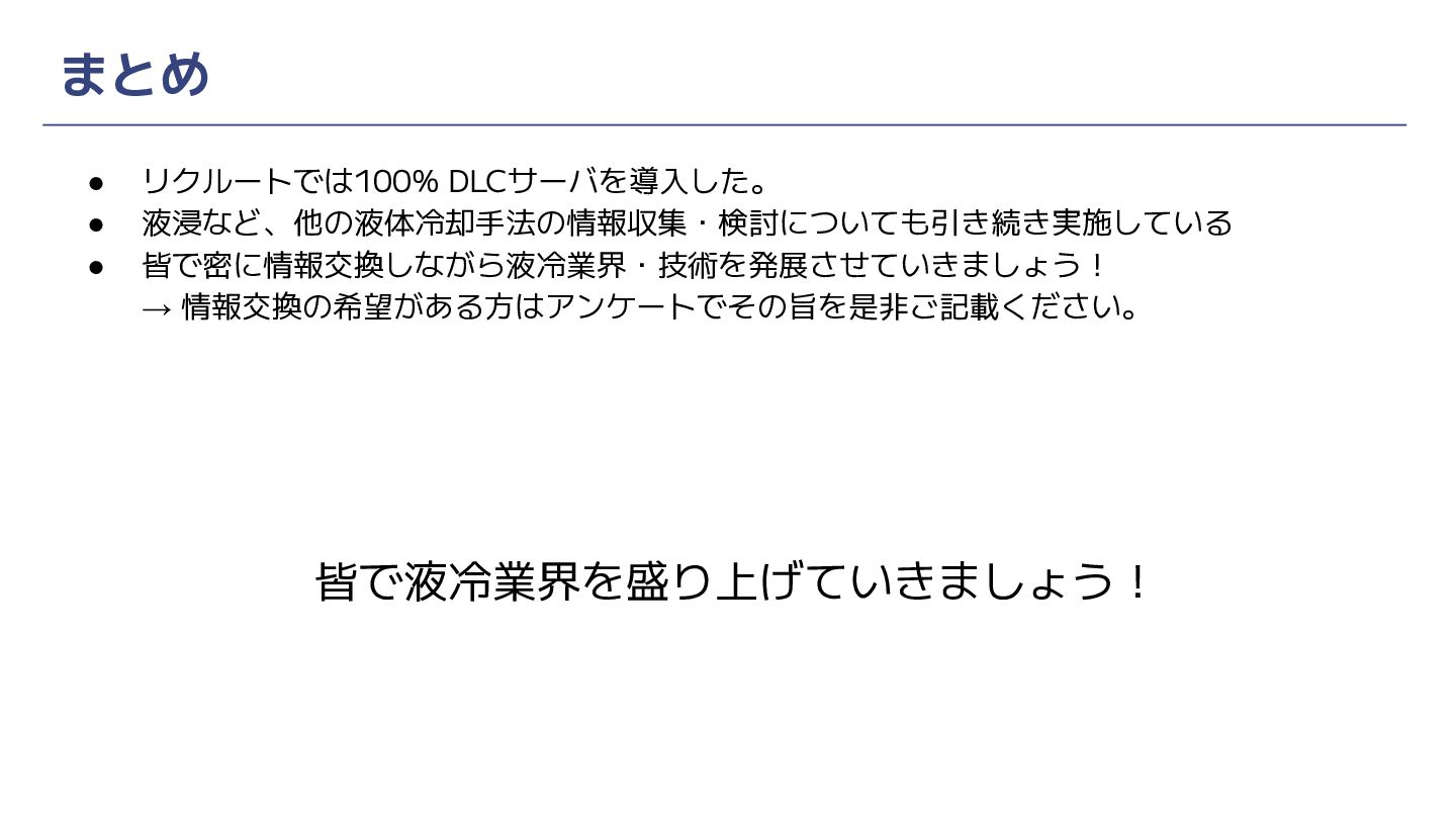 まとめ • リクルートでは100% DLCサーバを導入した。 • 液浸など、他の液体冷却手法の情報収集・検討についても引き続き実施している • 皆で密に情報交換しながら液冷業界・技術を発展させていきましょう! → 情報交換の希望がある方はアンケートでその旨を是非ご記載ください。