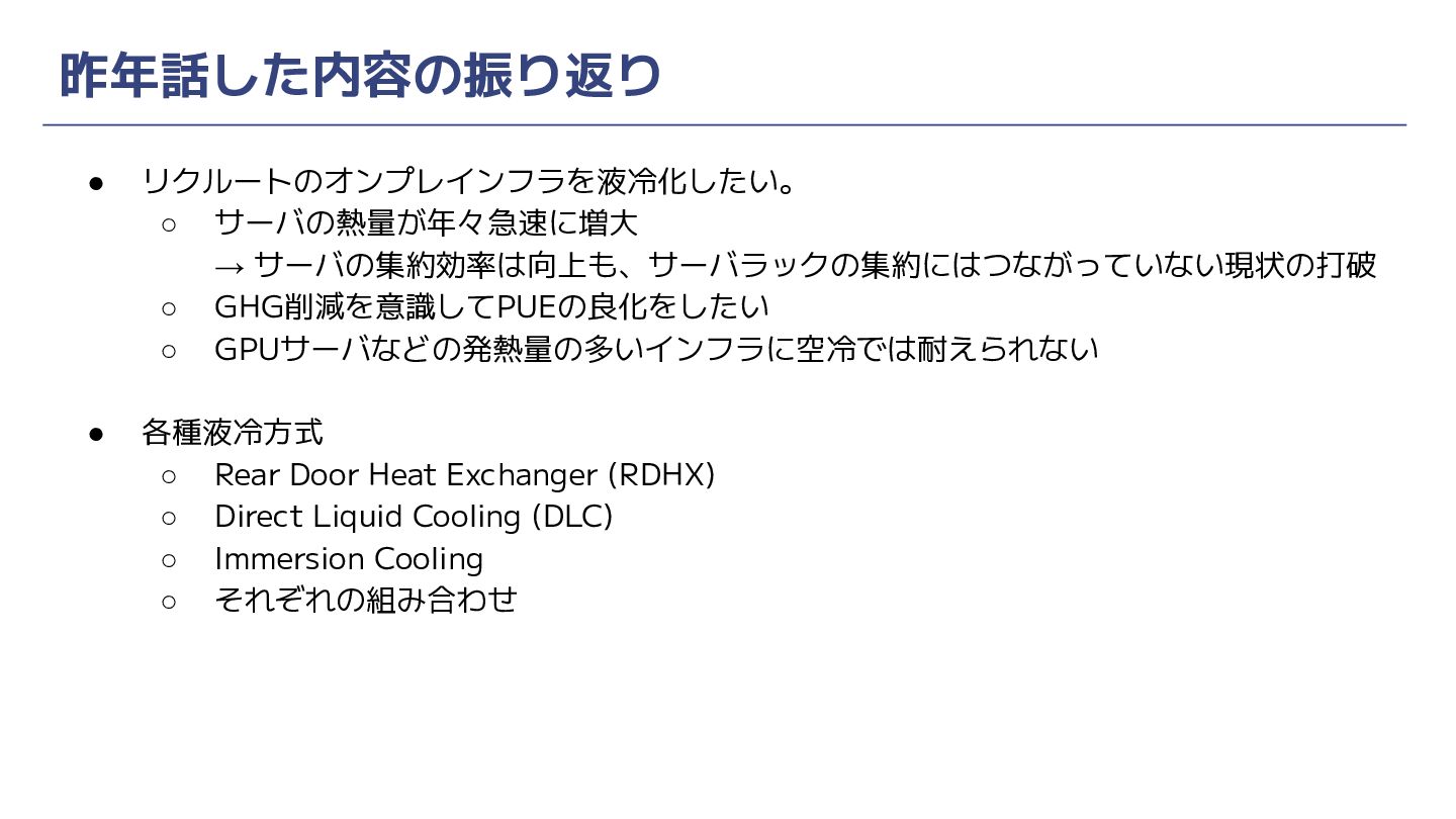 昨年話した内容の振り返り • リクルートのオンプレインフラを液冷化したい。 ◦ サーバの熱量が年々急速に増大 → サーバの集約効率は向上も、サーバラックの集約にはつながっていない現状の打破 ◦ GHG削減を意識してPUEの良化をしたい ◦