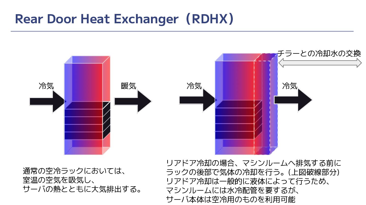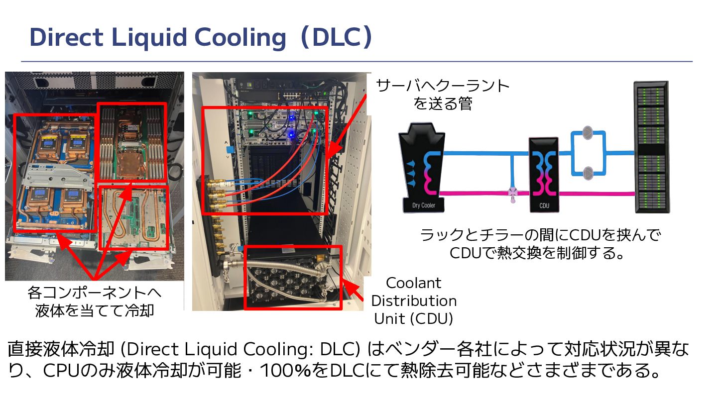 GPUサーバなどの発熱量の多いインフラに空冷では耐えられない • 各種液冷方式 ◦ Rear Door Heat Exchanger (RDHX) ◦ Direct Liquid Cooling (DLC) ◦ Immersion Cooling ◦ それぞれの組み合わせ