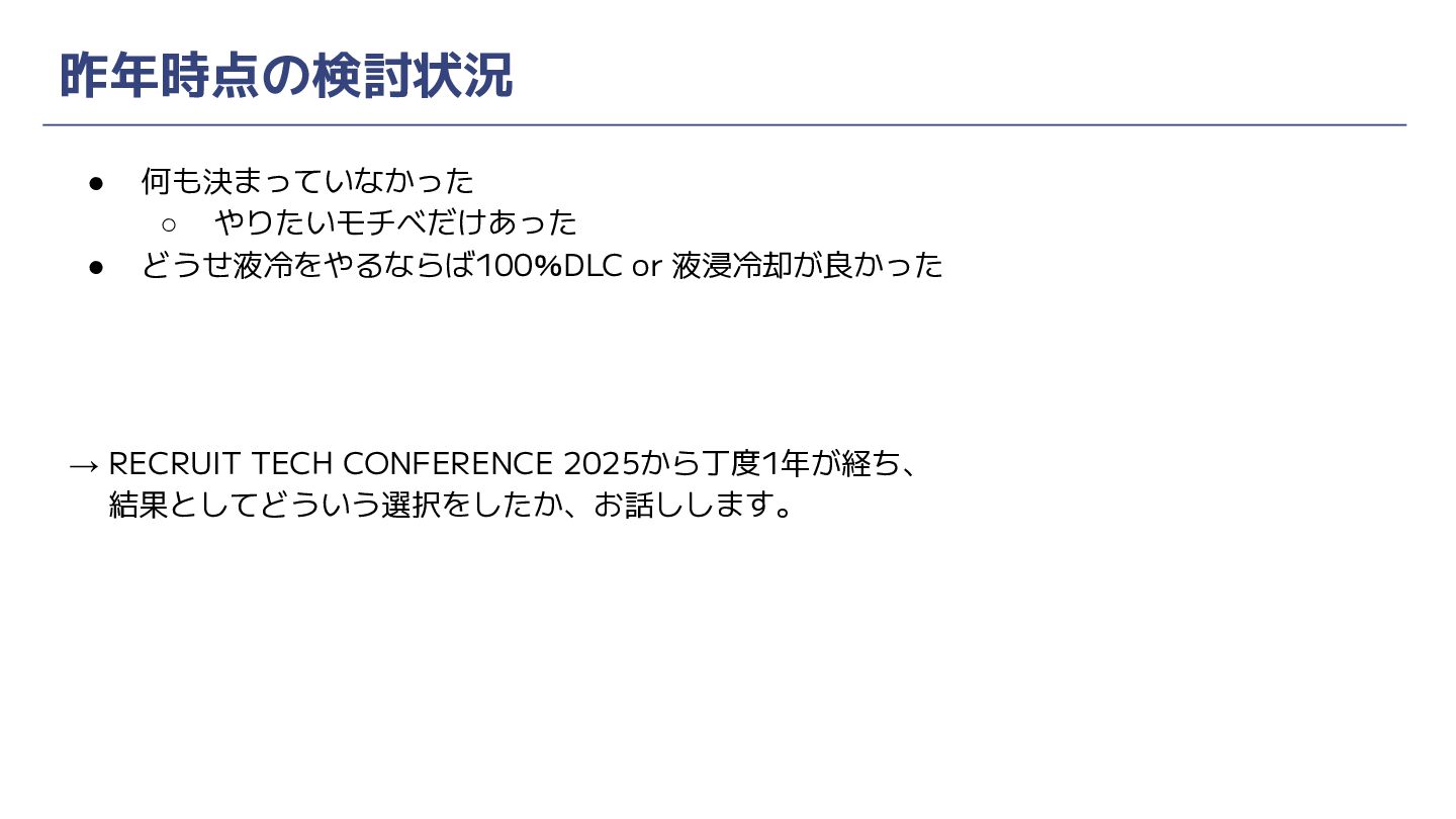 昨年時点の検討状況 • 何も決まっていなかった ◦ やりたいモチベだけあった • どうせ液冷をやるならば100%DLC or 液浸冷却が良かった →