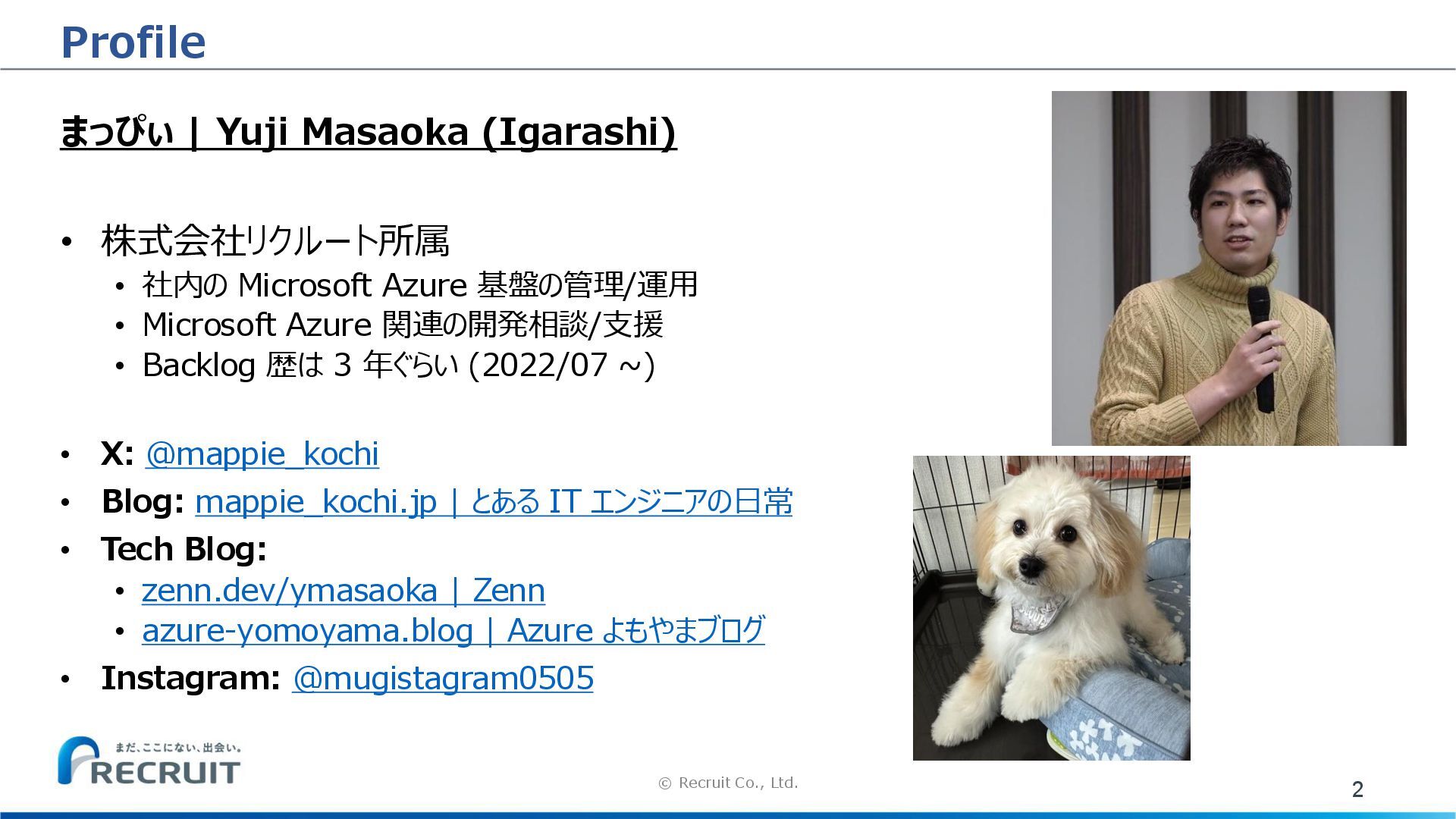 Yuji Masaoka (Igarashi) • 株式会社リクルート所属 • 社内の Microsoft Azure 基盤の管理/運用 • Microsoft Azure 関連の開発相談/支援 • Backlog 歴は 3 年ぐらい (2022/07 ~) • X: @mappie_kochi • Blog: mappie_kochi.jp | とある IT エンジニアの日常 • Tech Blog: • zenn.dev/ymasaoka | Zenn • azure-yomoyama.blog | Azure よもやまブログ • Instagram: @mugistagram0505