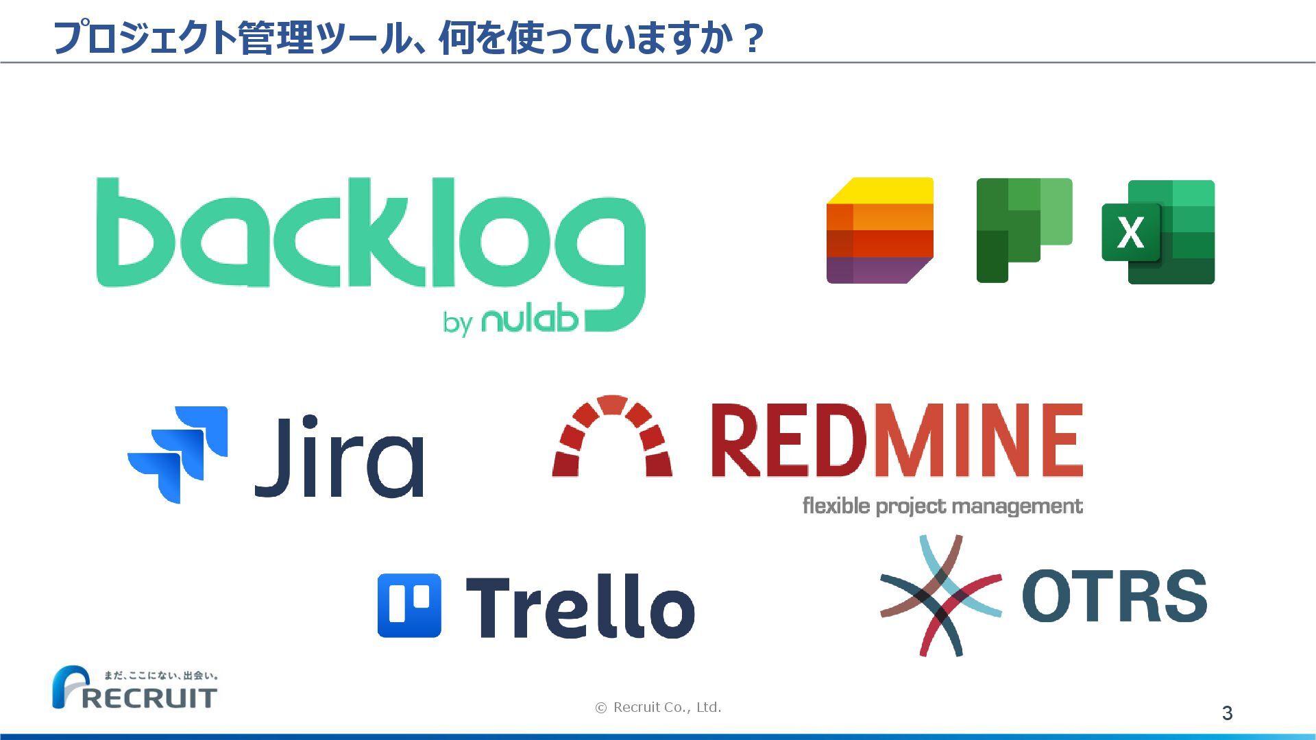 マスタ タイトルの書式設定 3 © Recruit Co., Ltd. プロジェクト管理ツール、何を使っていますか?
