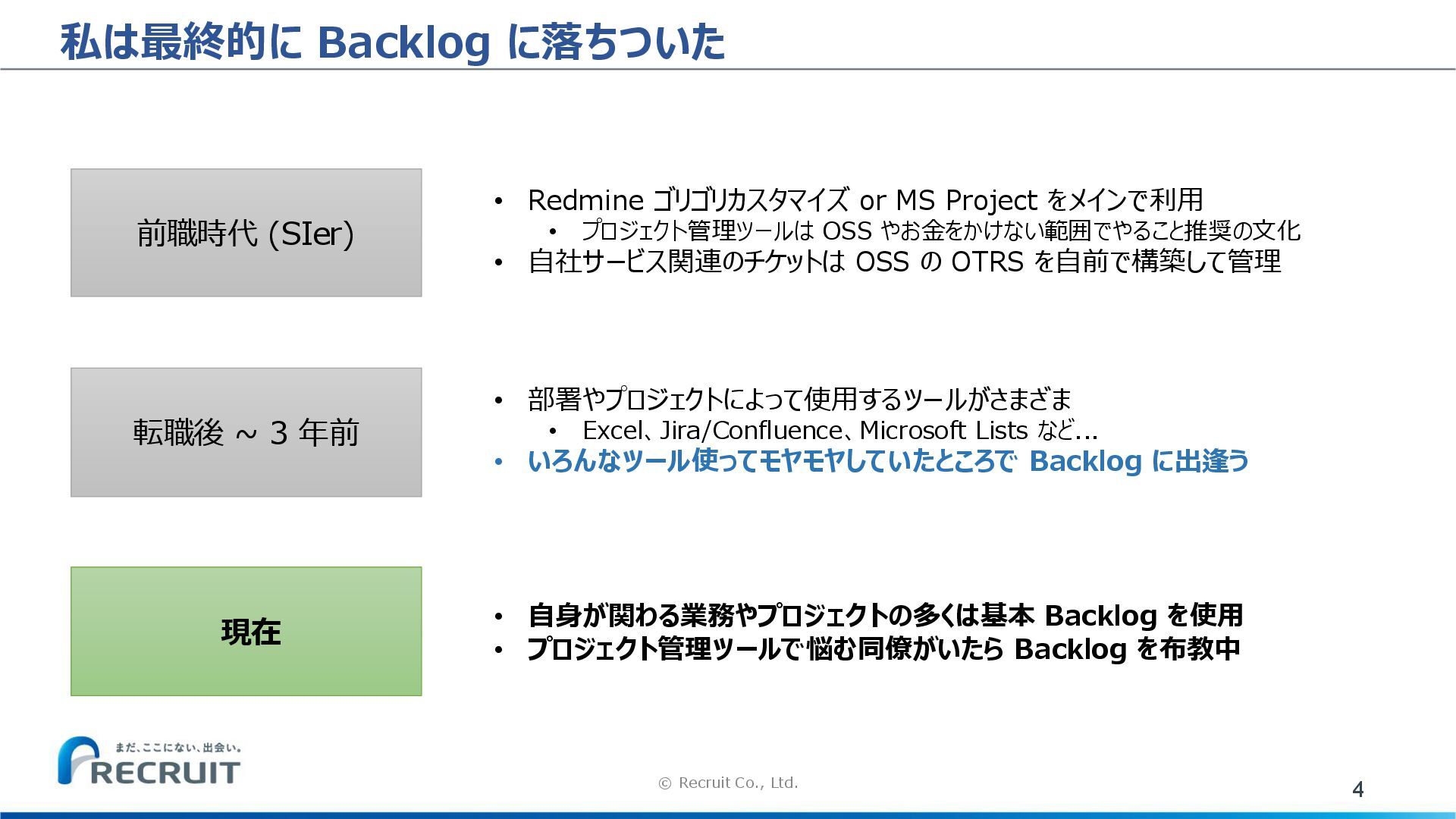 前職時代 (SIer) 転職後 ~ 3 年前 現在 • Redmine ゴリゴリカスタマイズ or MS Project をメインで利用 • プロジェクト管理ツールは OSS やお金をかけない範囲でやること推奨の文化 • 自社サービス関連のチケットは OSS の OTRS を自前で構築して管理 • 部署やプロジェクトによって使用するツールがさまざま • Excel、Jira/Confluence、Microsoft Lists など... • いろんなツール使ってモヤモヤしていたところで Backlog に出逢う • 自身が関わる業務やプロジェクトの多くは基本 Backlog を使用 • プロジェクト管理ツールで悩む同僚がいたら Backlog を布教中