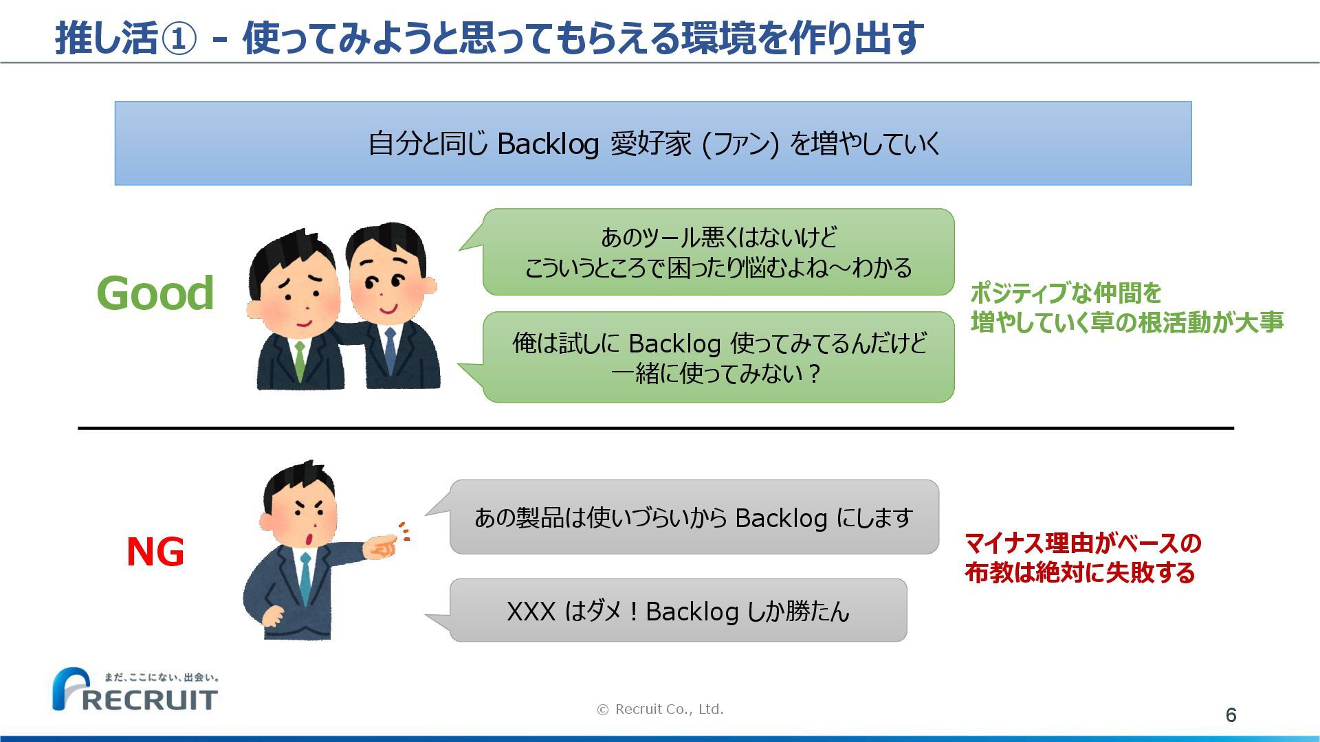 自分と同じ Backlog 愛好家 (ファン) を増やしていく あの製品は使いづらいから Backlog にします NG XXX はダメ!Backlog しか勝たん Good マイナス理由がベースの 布教は絶対に失敗する あのツール悪くはないけど こういうところで困ったり悩むよね〜わかる 俺は試しに Backlog 使ってみてるんだけど 一緒に使ってみない? ポジティブな仲間を 増やしていく草の根活動が大事