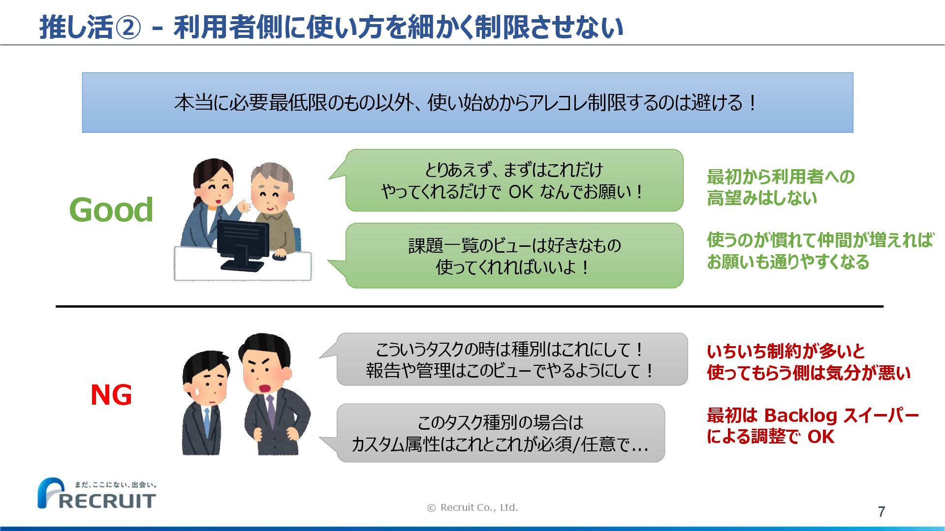 本当に必要最低限のもの以外、使い始めからアレコレ制限するのは避ける! NG Good こういうタスクの時は種別はこれにして! 報告や管理はこのビューでやるようにして! このタスク種別の場合は カスタム属性はこれとこれが必須/任意で... いちいち制約が多いと 使ってもらう側は気分が悪い 最初は Backlog スイーパー による調整で OK とりあえず、まずはこれだけ やってくれるだけで OK なんでお願い! 課題一覧のビューは好きなもの 使ってくれればいいよ! 最初から利用者への 高望みはしない 使うのが慣れて仲間が増えれば お願いも通りやすくなる