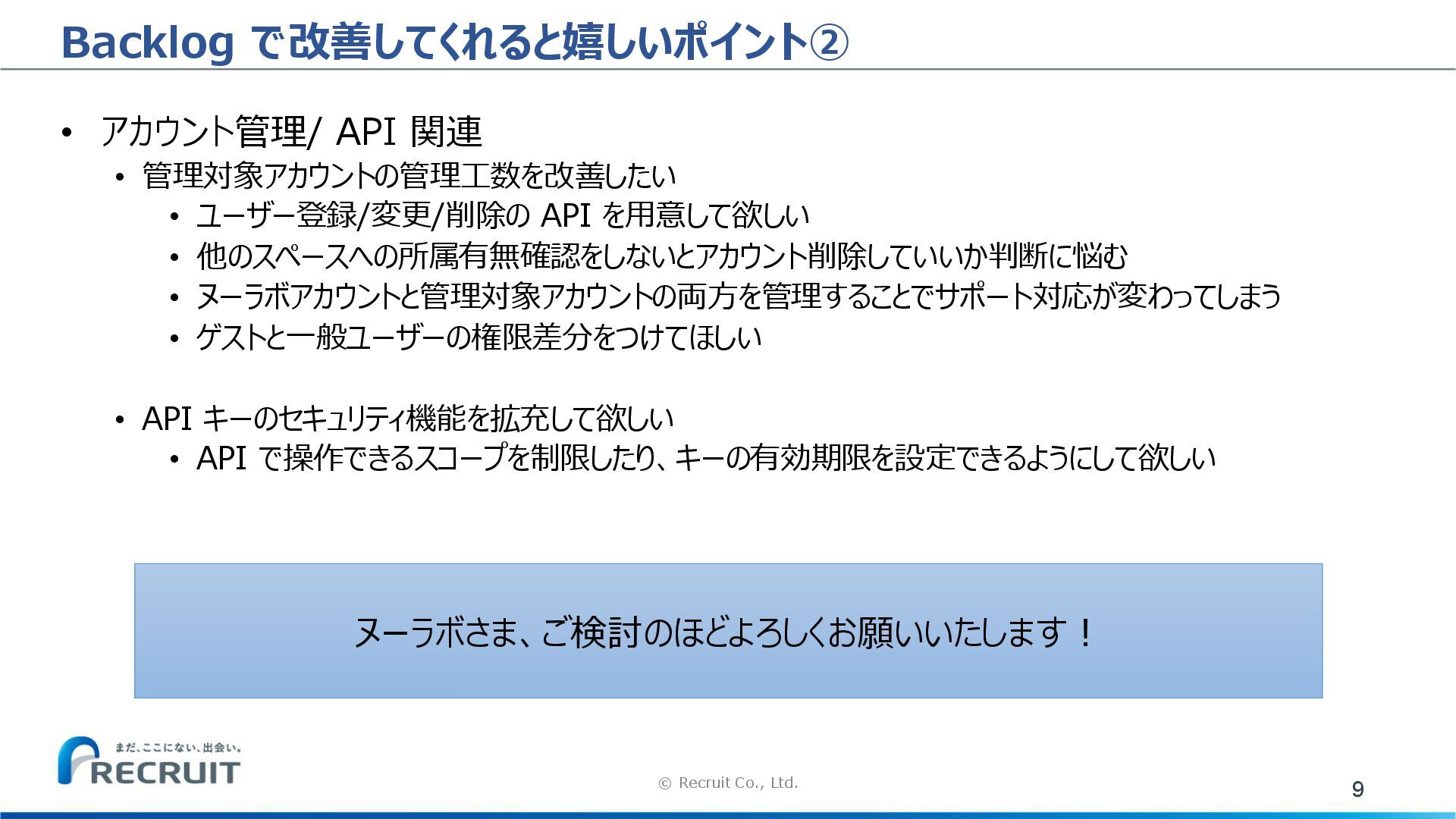アカウント管理/ API 関連 • 管理対象アカウントの管理工数を改善したい • ユーザー登録/変更/削除の API を用意して欲しい • 他のスペースへの所属有無確認をしないとアカウント削除していいか判断に悩む • ヌーラボアカウントと管理対象アカウントの両方を管理することでサポート対応が変わってしまう • ゲストと一般ユーザーの権限差分をつけてほしい • API キーのセキュリティ機能を拡充して欲しい • API で操作できるスコープを制限したり、キーの有効期限を設定できるようにして欲しい ヌーラボさま、ご検討のほどよろしくお願いいたします!