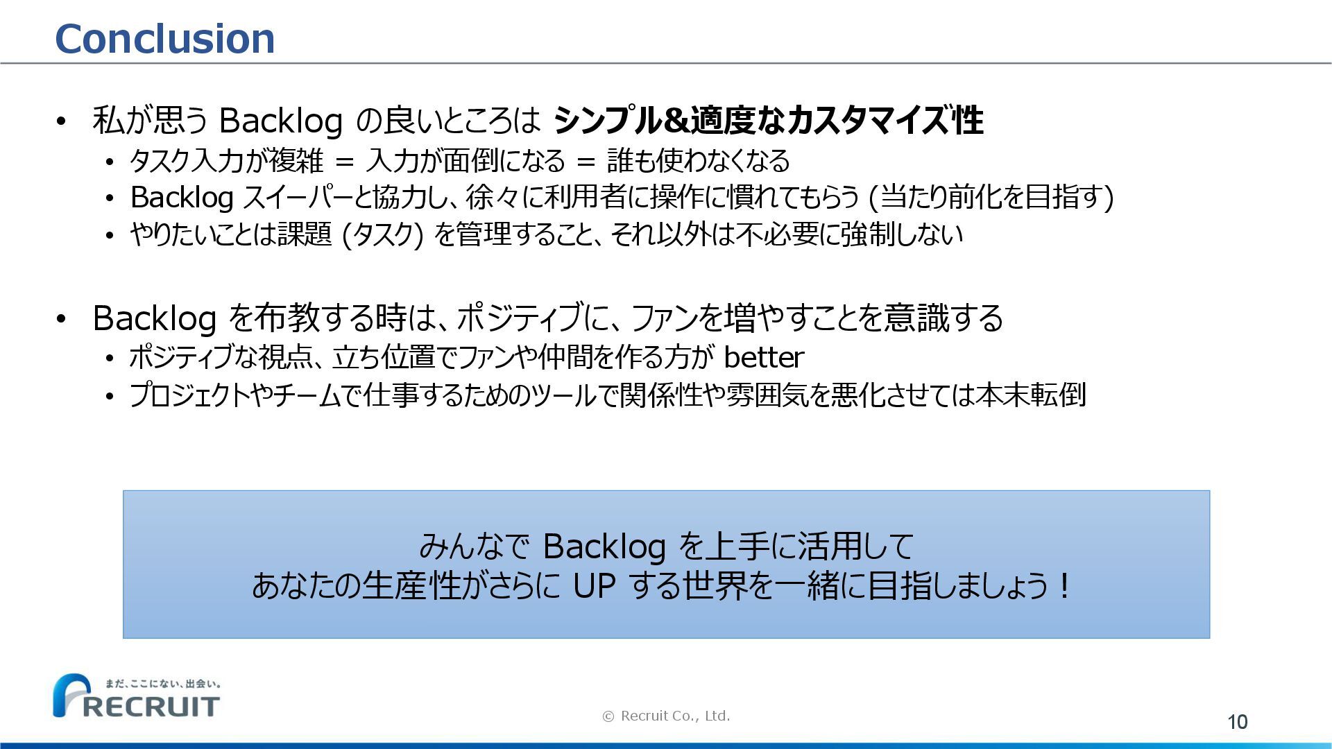 Backlog の良いところは シンプル&適度なカスタマイズ性 • タスク入力が複雑 = 入力が面倒になる = 誰も使わなくなる • Backlog スイーパーと協力し、徐々に利用者に操作に慣れてもらう (当たり前化を目指す) • やりたいことは課題 (タスク) を管理すること、それ以外は不必要に強制しない • Backlog を布教する時は、ポジティブに、ファンを増やすことを意識する • ポジティブな視点、立ち位置でファンや仲間を作る方が better • プロジェクトやチームで仕事するためのツールで関係性や雰囲気を悪化させては本末転倒 みんなで Backlog を上手に活用して あなたの生産性がさらに UP する世界を一緒に目指しましょう!