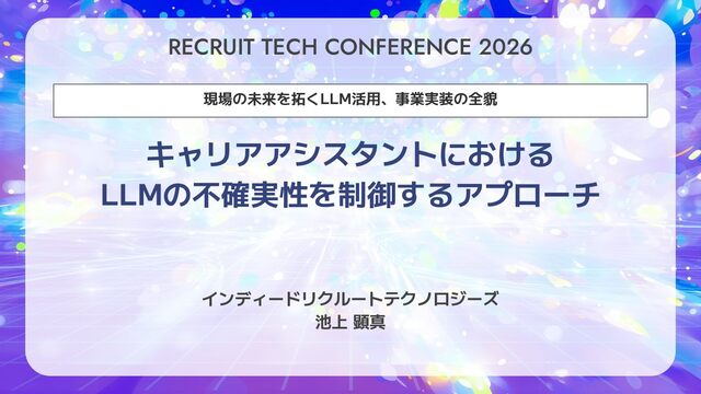 RECRUIT TECH CONFERENCE 2026 現場の未来を拓くLLM活用、事業実装の全貌 キャリアアシスタントにおける LLMの不確実性を制御するアプローチ インディードリクルートテクノロジーズ 池上 顕真