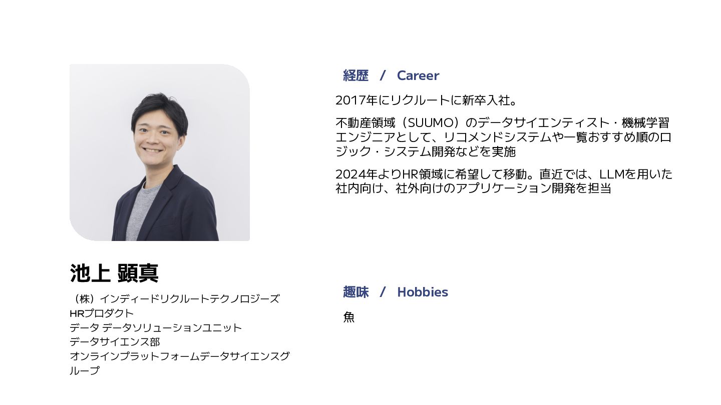 2024年よりHR領域に希望して移動。直近では、LLMを用いた 社内向け、社外向けのアプリケーション開発を担当 趣味 / Hobbies (株)インディードリクルートテクノロジーズ HRプロダクト データ データソリューションユニット データサイエンス部 オンラインプラットフォームデータサイエンスグ ループ