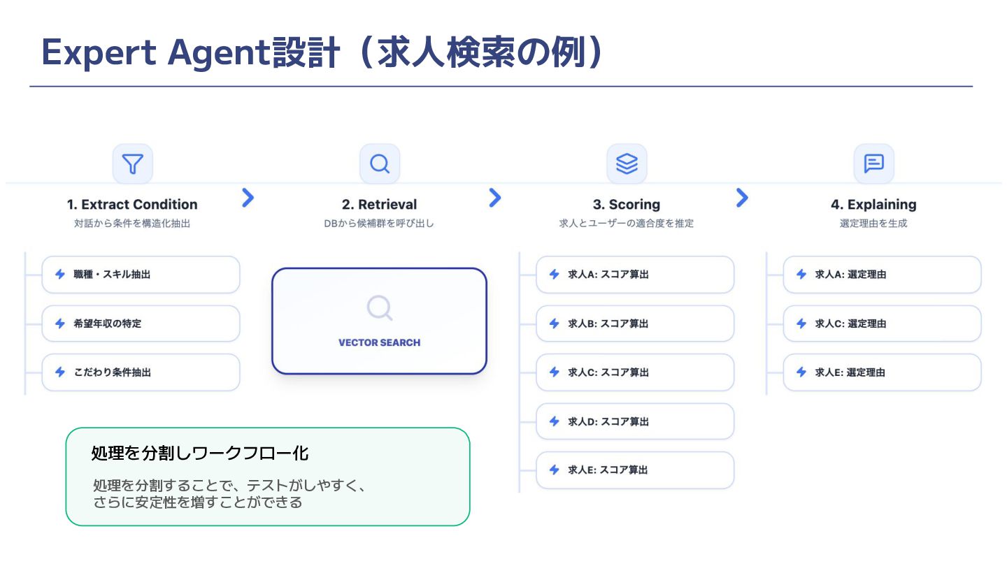 Expert Agent設計(求人検索の例) 会社情報 Agent キャリア相談 Agent 自由対話 Agent 処理を分割しワークフロー化 処理を分割することで、テストがしやすく、