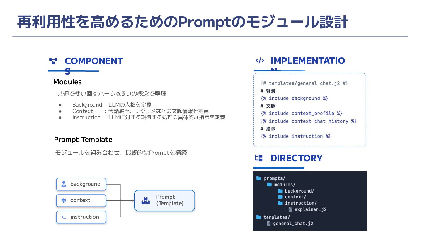 再利用性を高めるためのPromptのモジュール設計 COMPONENT S IMPLEMENTATIO N DIRECTORY Modules 共通で使い回すパーツを3つの概念で整理 Prompt Template