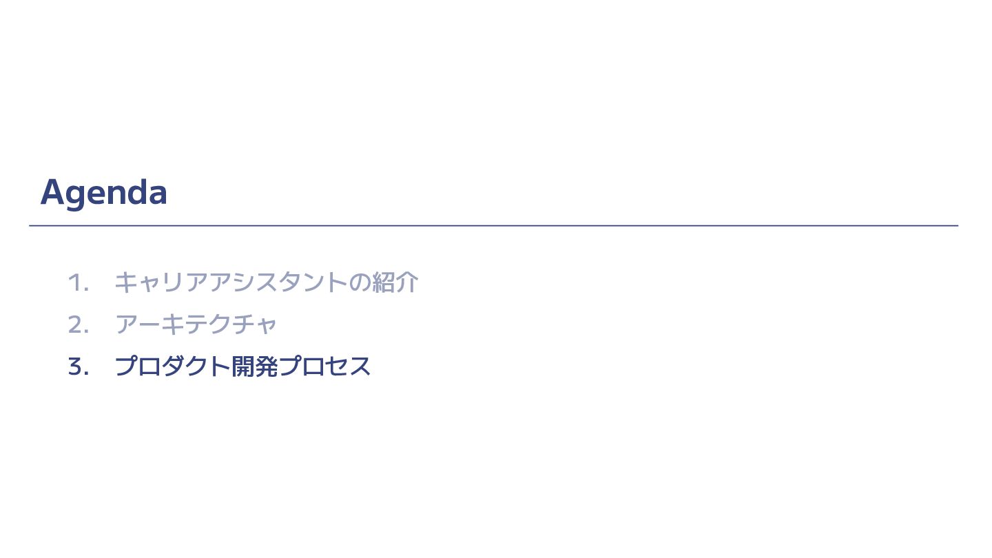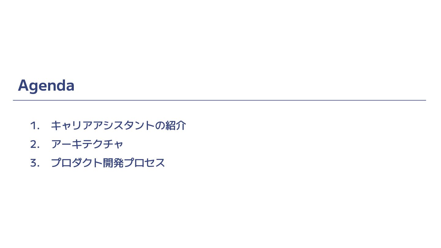 Agenda 1. キャリアアシスタントの紹介 2. アーキテクチャ 3. プロダクト開発プロセス