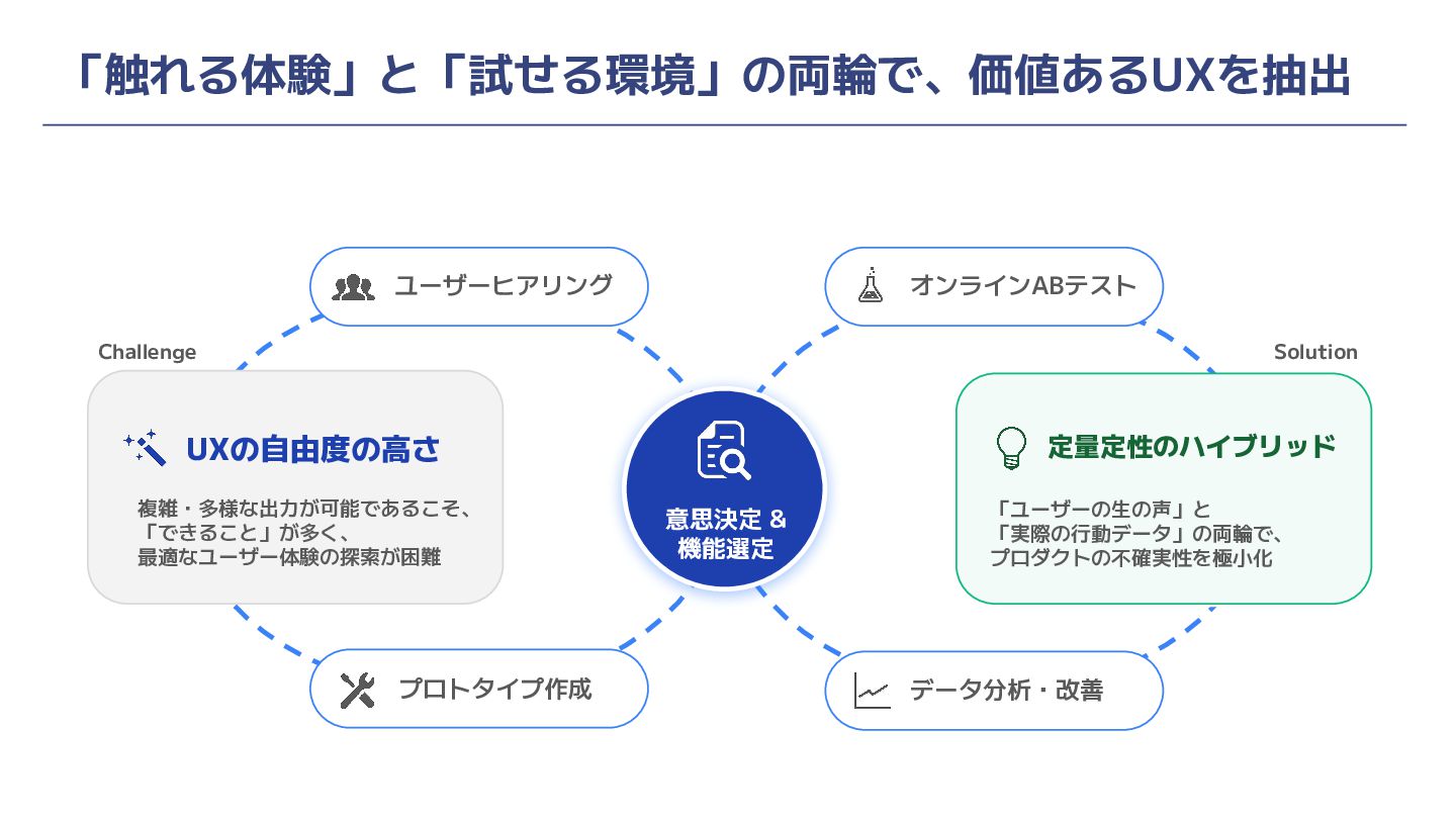 「触れる体験」と「試せる環境」の両輪で、価値あるUXを抽出 プロトタイプ作成 ユーザーヒアリング オンラインABテスト データ分析・改善 意思決定 & 機能選定 UXの自由度の高さ 複雑・多様な出力が可能であるこそ、
