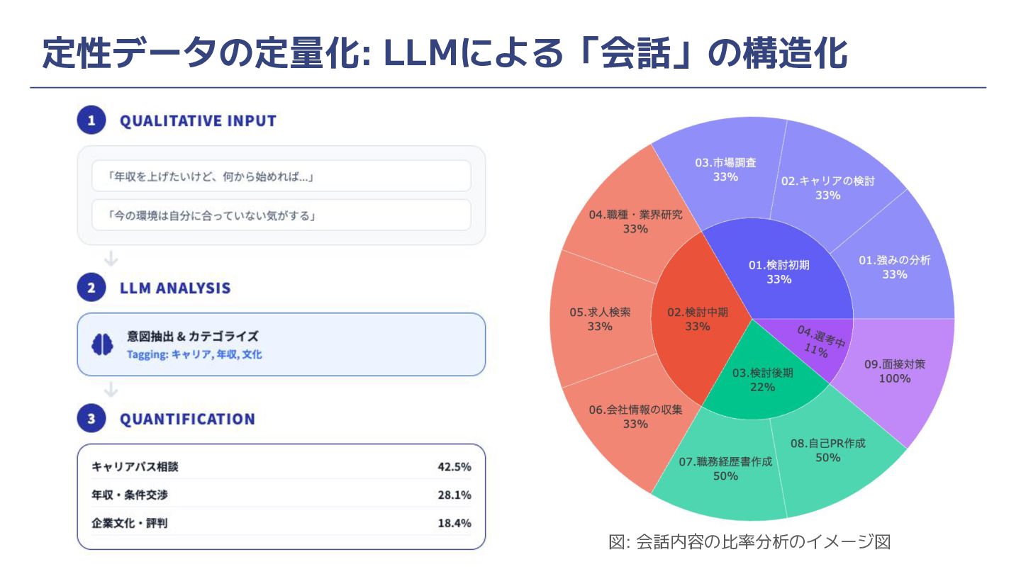 定性データの定量化: LLMによる「会話」の構造化 図: 会話内容の比率分析のイメージ図