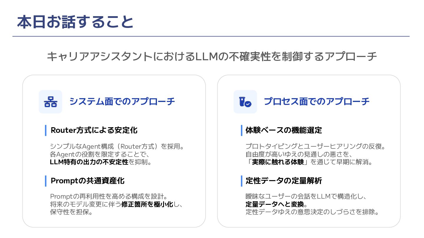 まとめ(再掲) キャリアアシスタントにおけるLLMの不確実性を制御するアプローチ システム面でのアプローチ Router方式による安定化 シンプルなAgent構成(Router方式)を採用。 各Agentの役割を限定することで、 LLM特有の出力の不安定性を抑制。 Promptの共通資産化 Promptの再利用性を高める構成を設計。 将来のモデル変更に伴う修正箇所を極小化し、